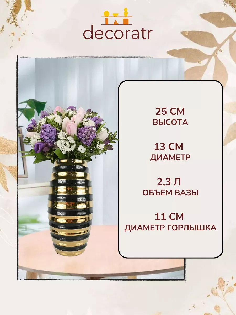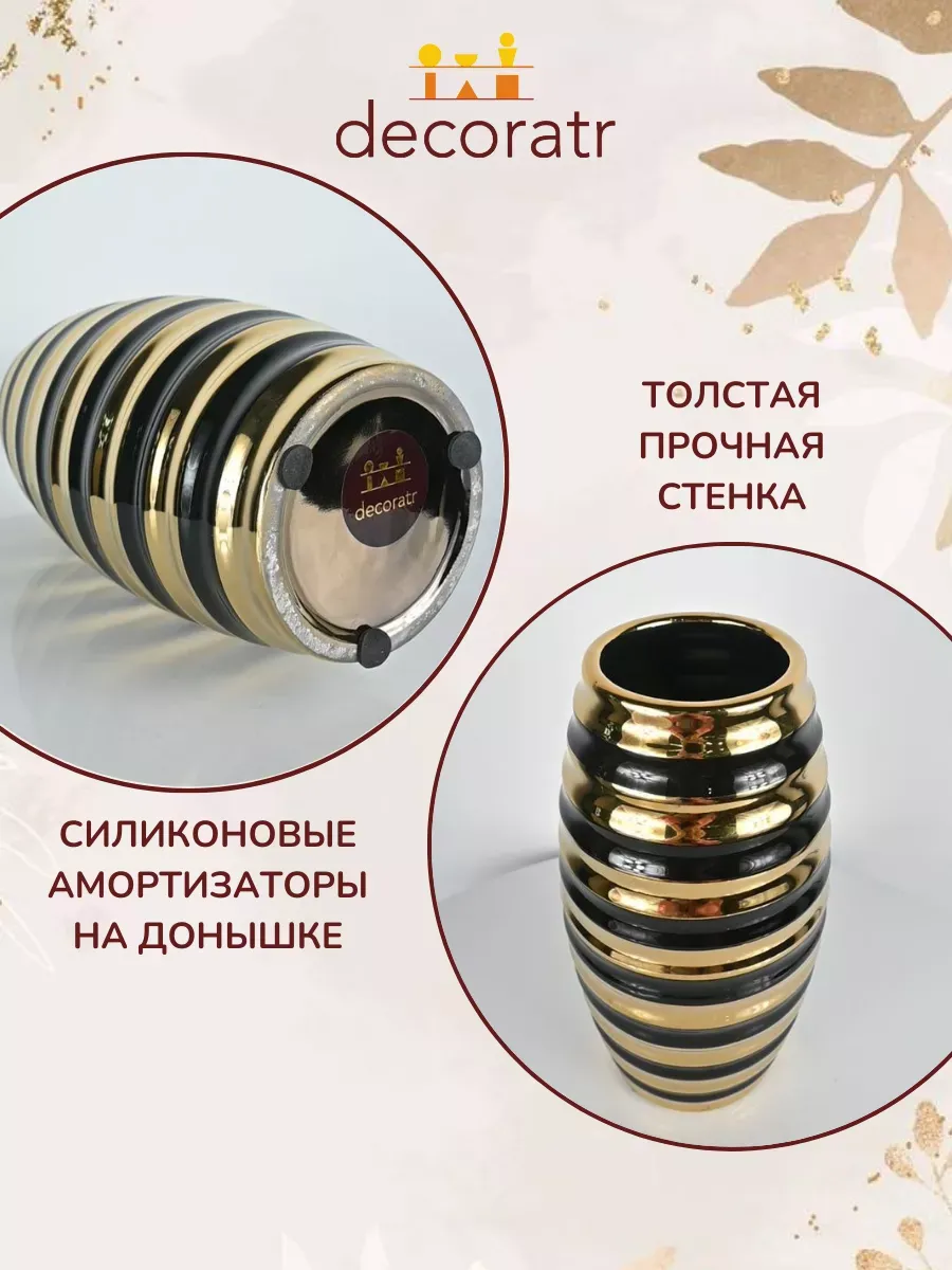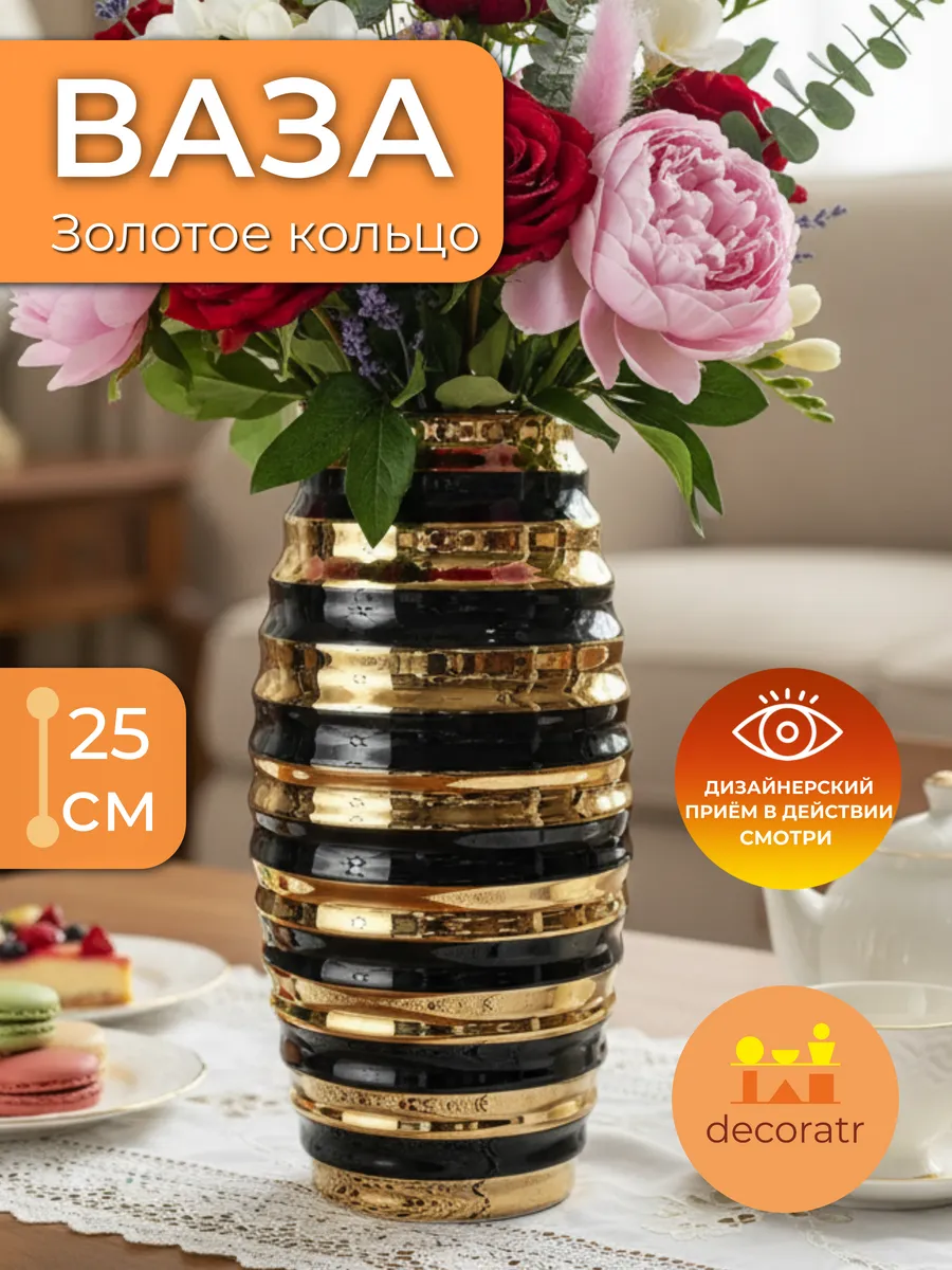Представьте себе вазу, которая словно драгоценность сияет в вашем доме! Ваза «Золотое кольцо» высотой 25 см — это керамическая интерьерная ваза для цветов, которая мгновенно преобразит любое пространство. Её уникальная форма с чередующимися чёрными и золотыми кольцами создаёт завораживающий ритм, словно музыка застыла в керамике.