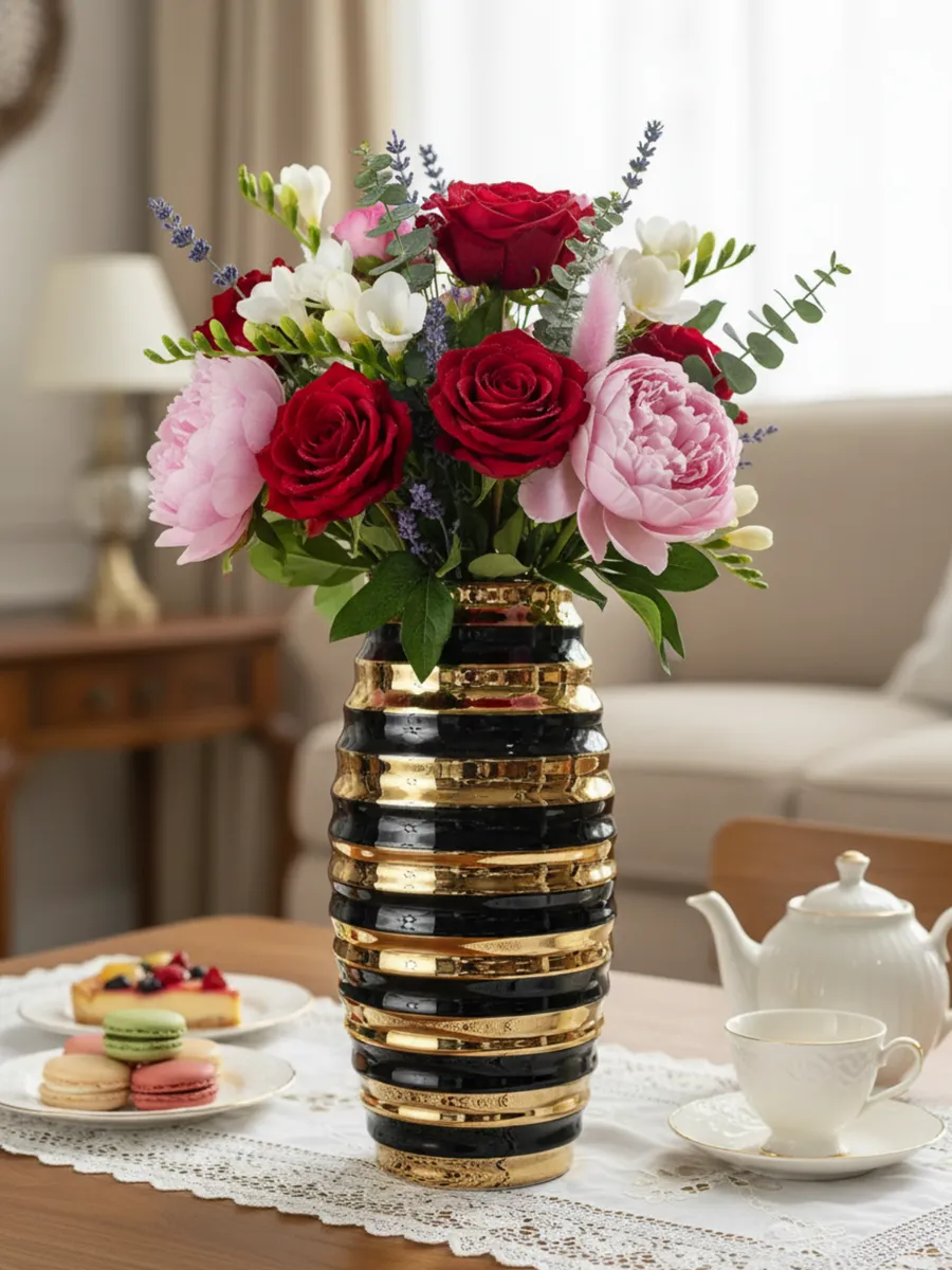 Именно то, что нужно для современного интерьера! Эта декоративная ваза для дома органично впишется в стиль арт-деко, минимализм или эклектику. Чёрно-золотая гамма универсальна — она подчеркнёт изысканность гостиной, добавит роскоши в спальню или станет акцентом в кабинете. В отелях и ресторанах такая ваза создаёт атмосферу премиального сервиса.
