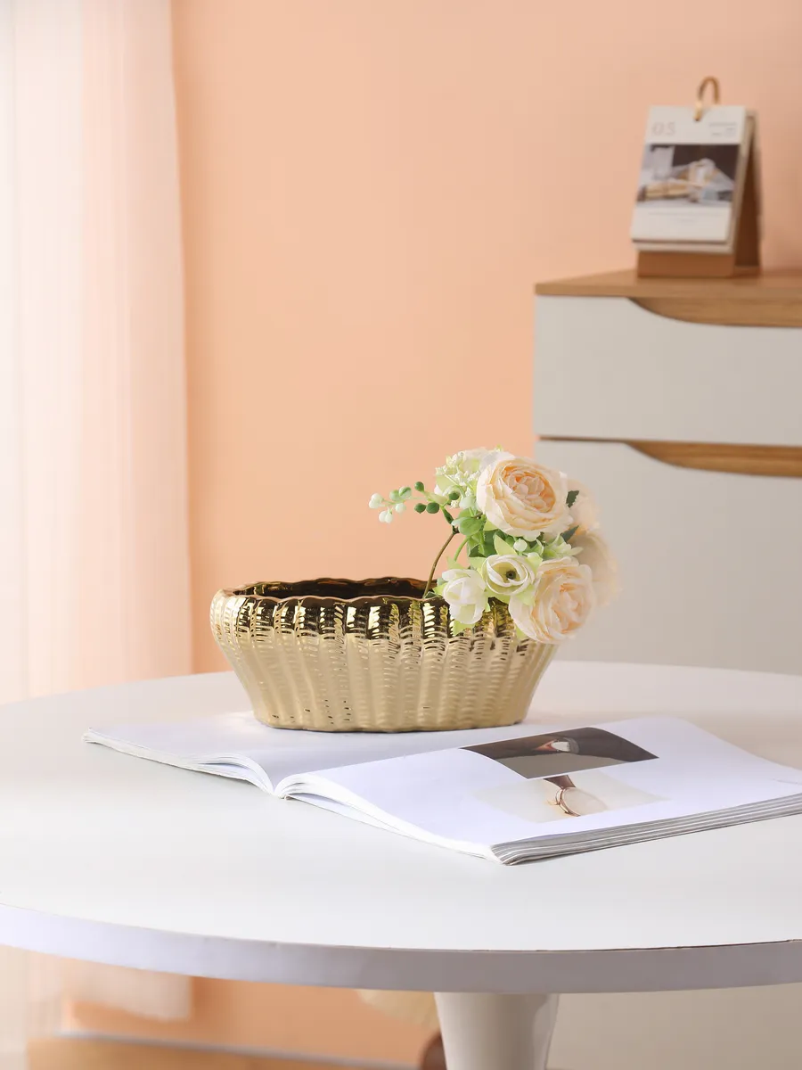 Представьте себе: высота всего 9,5 см, а какое великолепие! Ваза «Золотая Корзина» — керамическая интерьерная ваза для цветов, которая словно создана из застывшего солнечного света. Этот изысканный предмет декора мгновенно превращает любое пространство в оазис элегантности и уюта.
