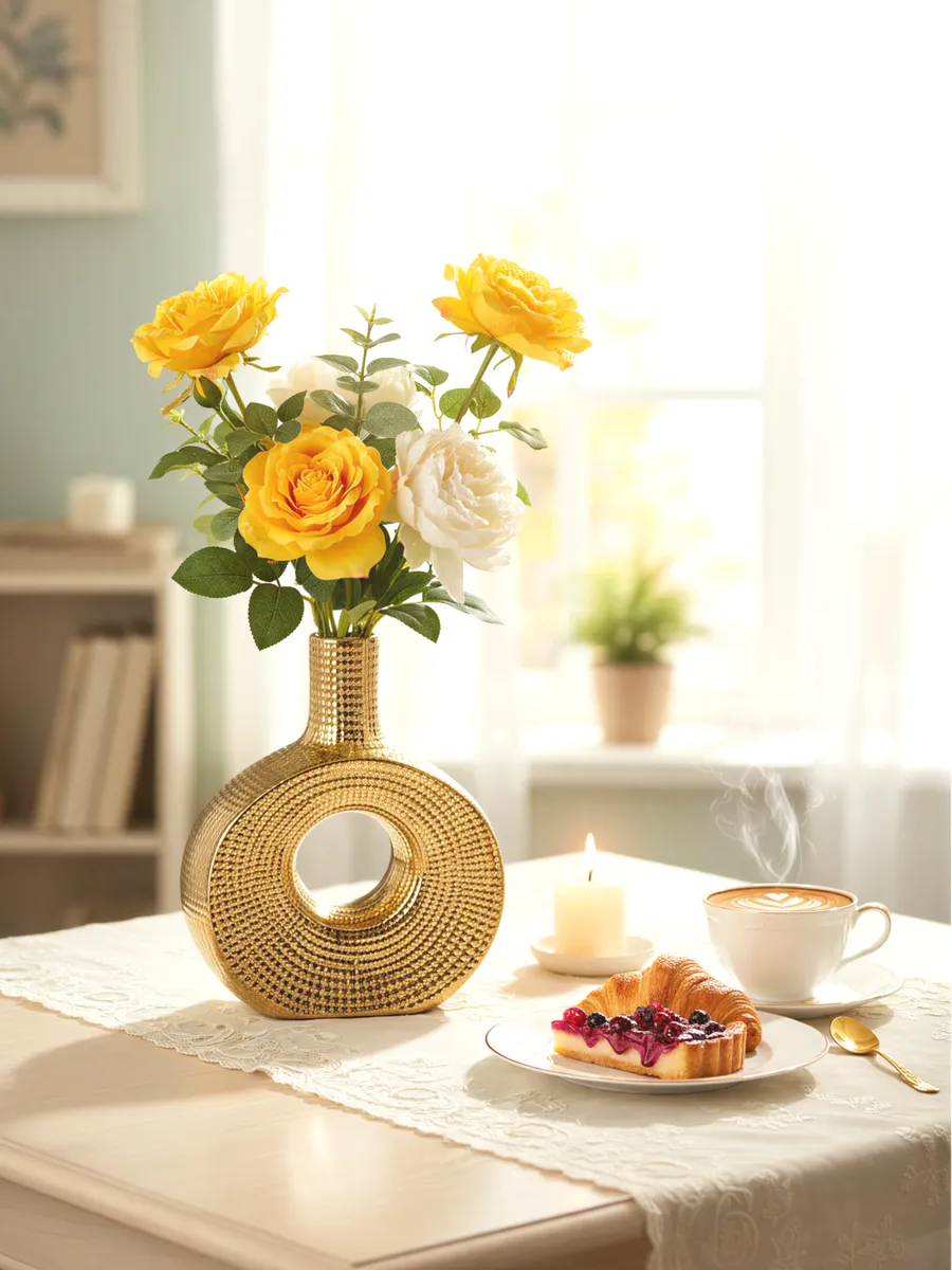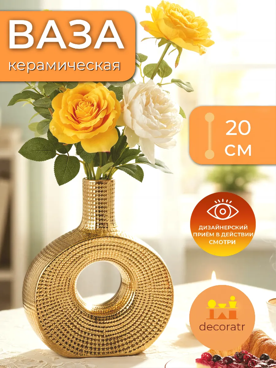 Ваза керамическая с полой сердцевиной, невысокая и средняя, высота 20 см, настольная, глянцевая и непрозрачная, с рельефной поверхностью. Ваза керамическая золотая для цветов — превратите дом в галерею роскоши! Представьте себе вазу, которая словно солнечный луч застыл в керамике! Ваза «Золотое кольцо» высотой 20 см — это настоящее произведение искусства, которое мгновенно преобразит любой интерьер.…