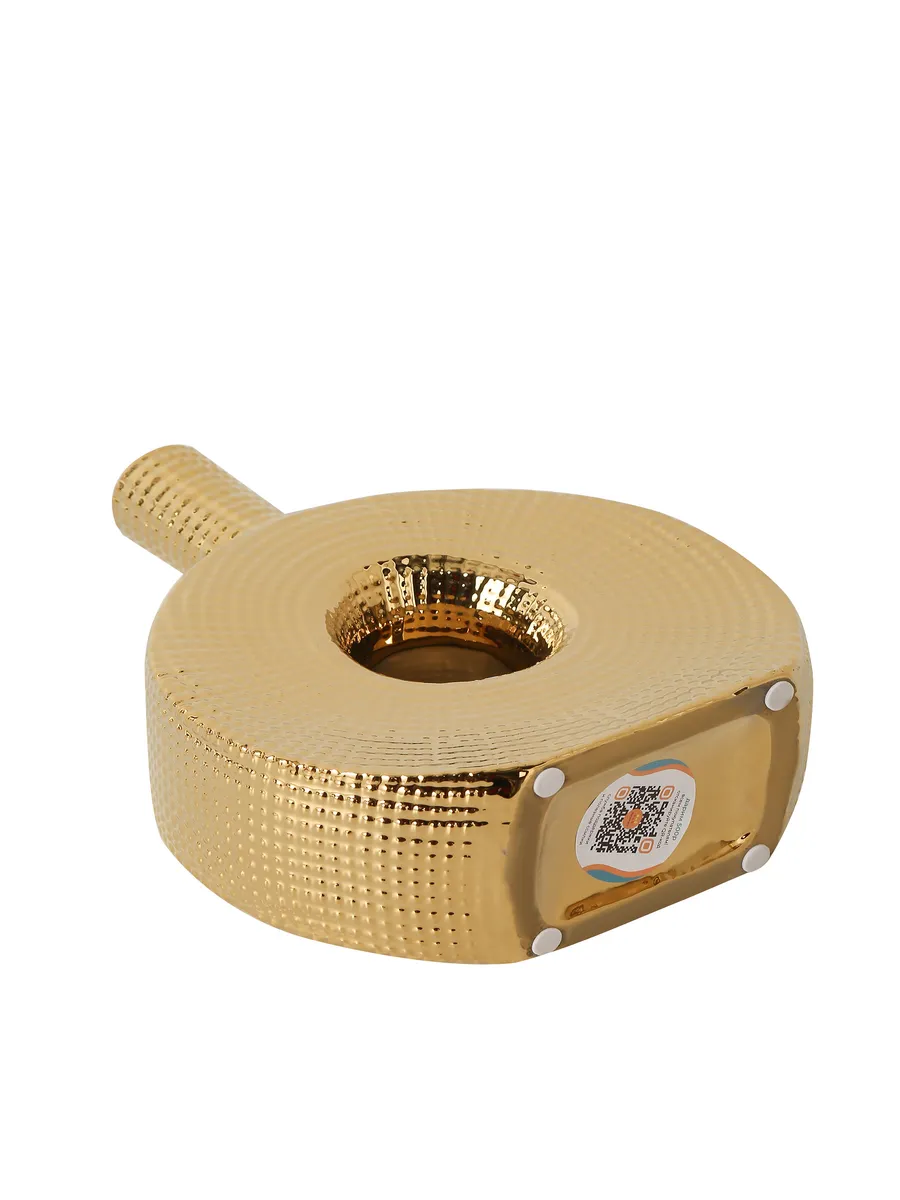Керамическая ваза для дома выполнена в стиле арт-деко с современными нотками минимализма. Её текстурированная поверхность с мелкими точечными углублениями создаёт завораживающую игру света и тени. Золотистый цвет излучает тепло и роскошь, мгновенно повышая статус любого пространства.