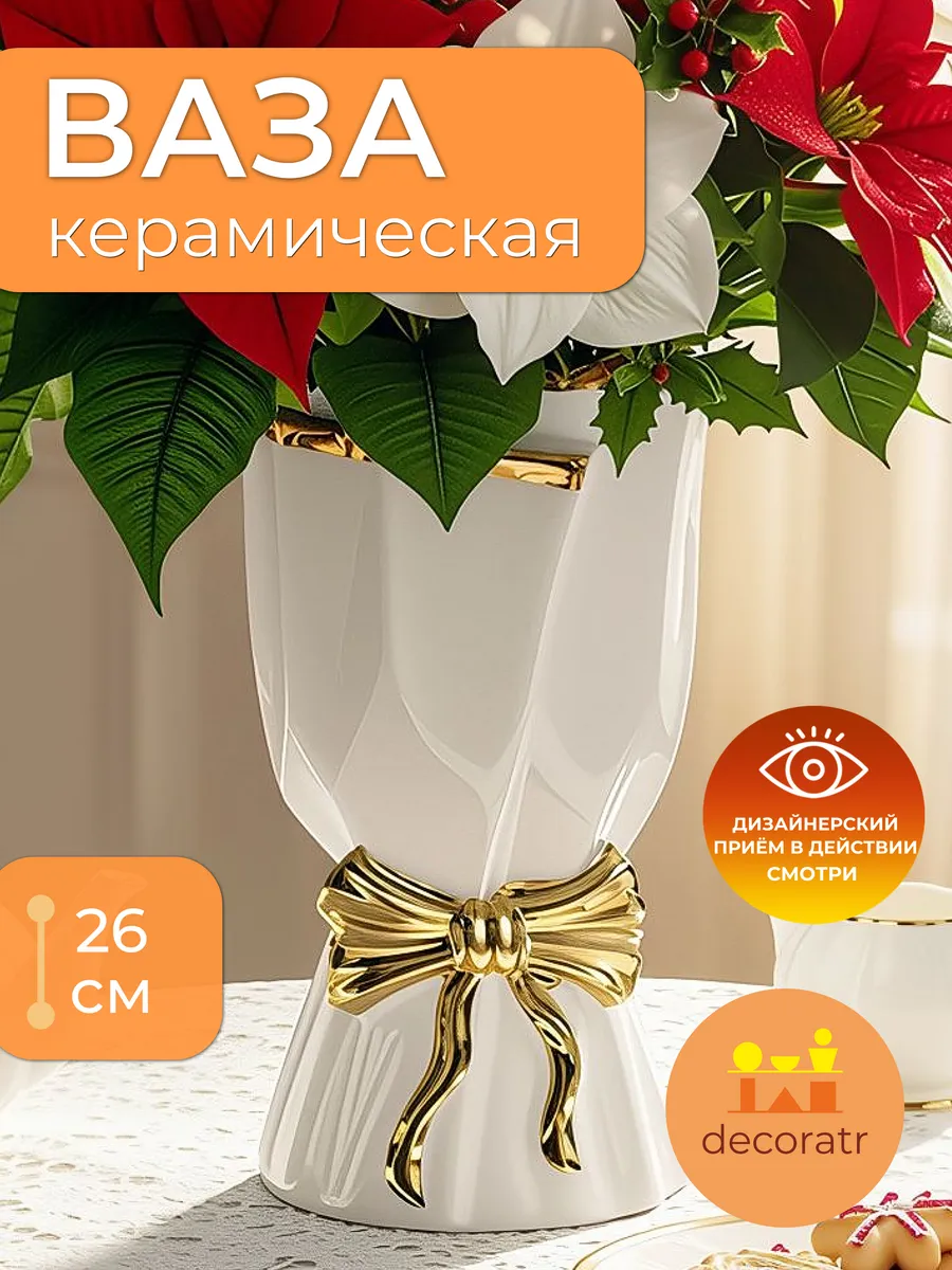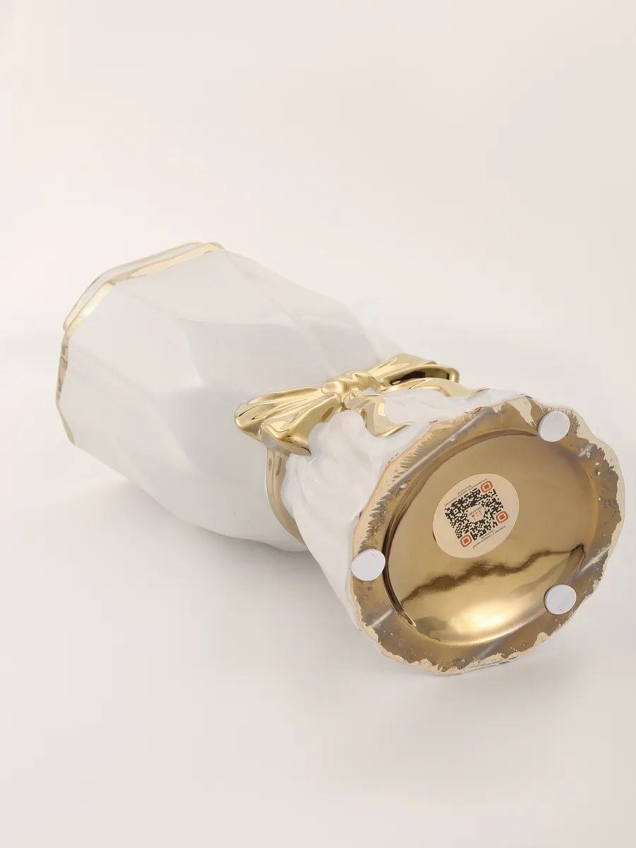 Керамическая ваза белая станет центральным украшением гостиной, добавит изысканности спальне или создаст уютную атмосферу на кухне. Этот декор для дома в классическом стиле с элементами арт-деко прекрасно впишется в интерьеры от минимализма до роскошной классики. Золотистый декоративный бант придаёт особую торжественность — словно каждый день в вашем доме становится маленьким праздником!