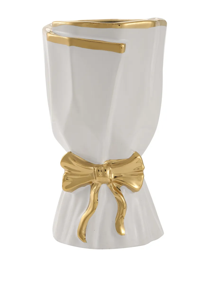 Декоративные элементы: Объёмный золотистый бант у основания; гладкая глянцевая поверхность; контрастное сочетание белого и золотого цветов.
