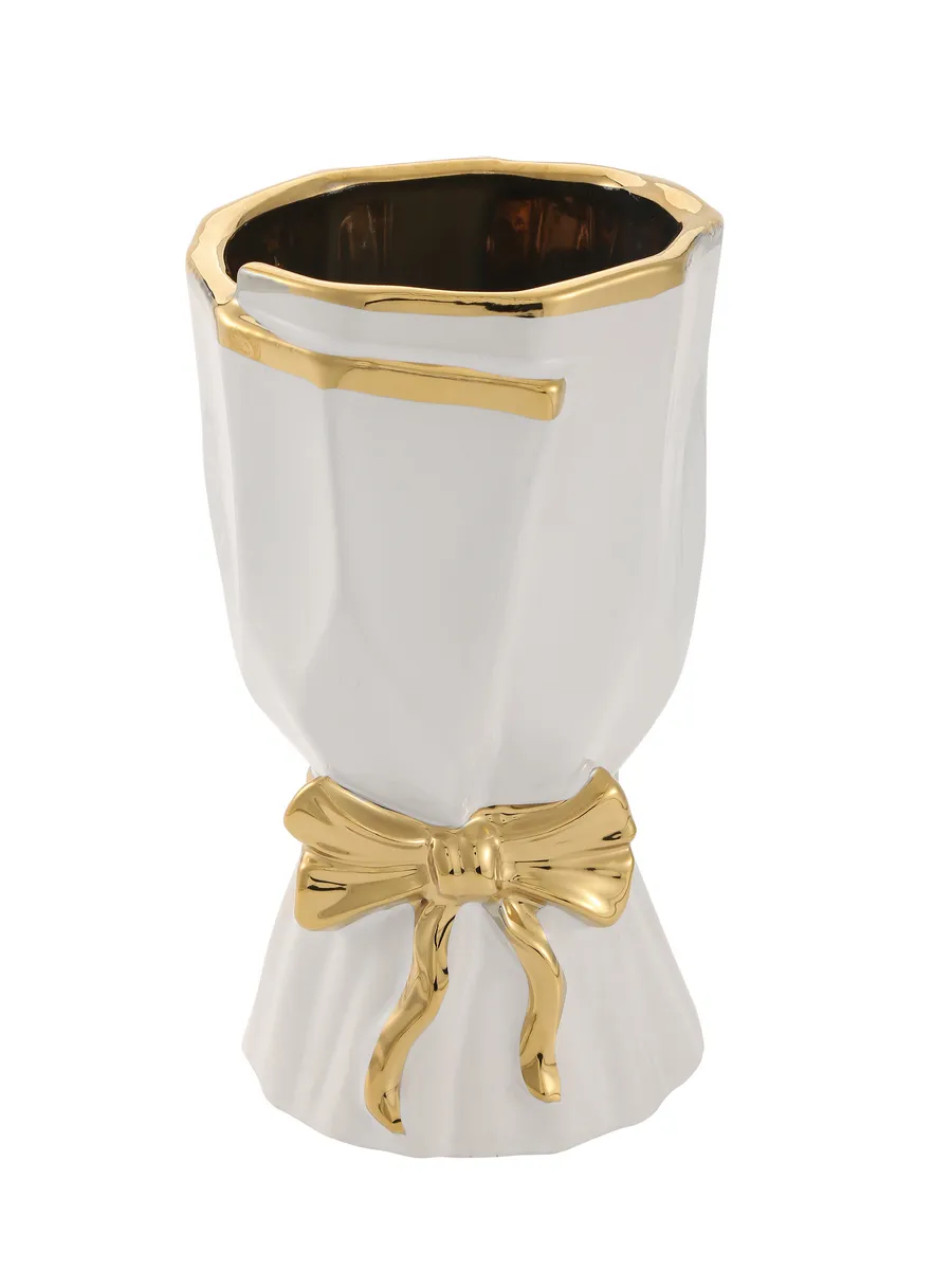 Ваза керамическая для цветов белая с золотым бантом 26 см!