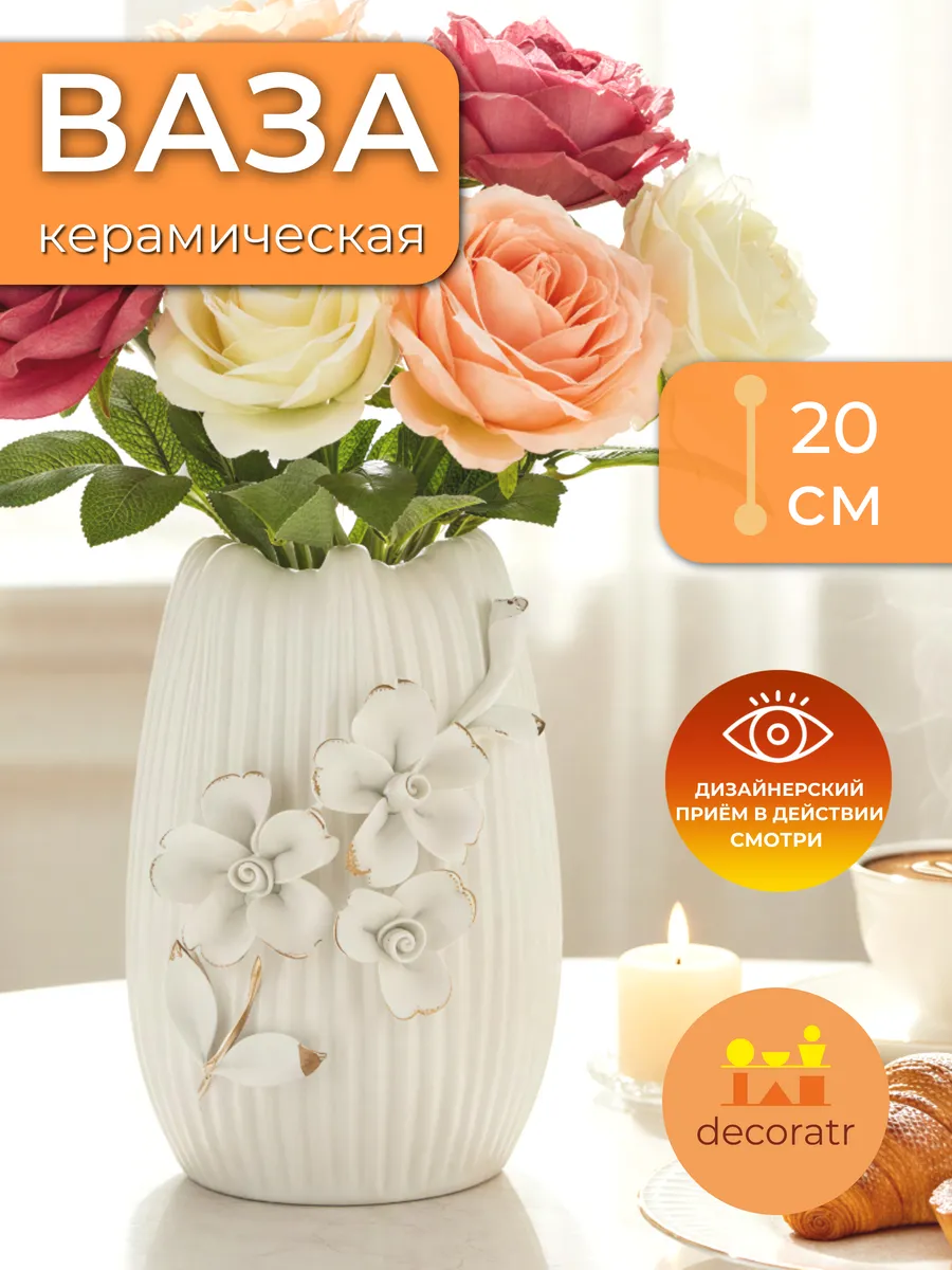 Ваза керамическая белая, невысокая и средняя, высота 20 см, настольная, матовая и непрозрачная, с аппликацией в виде цветов.