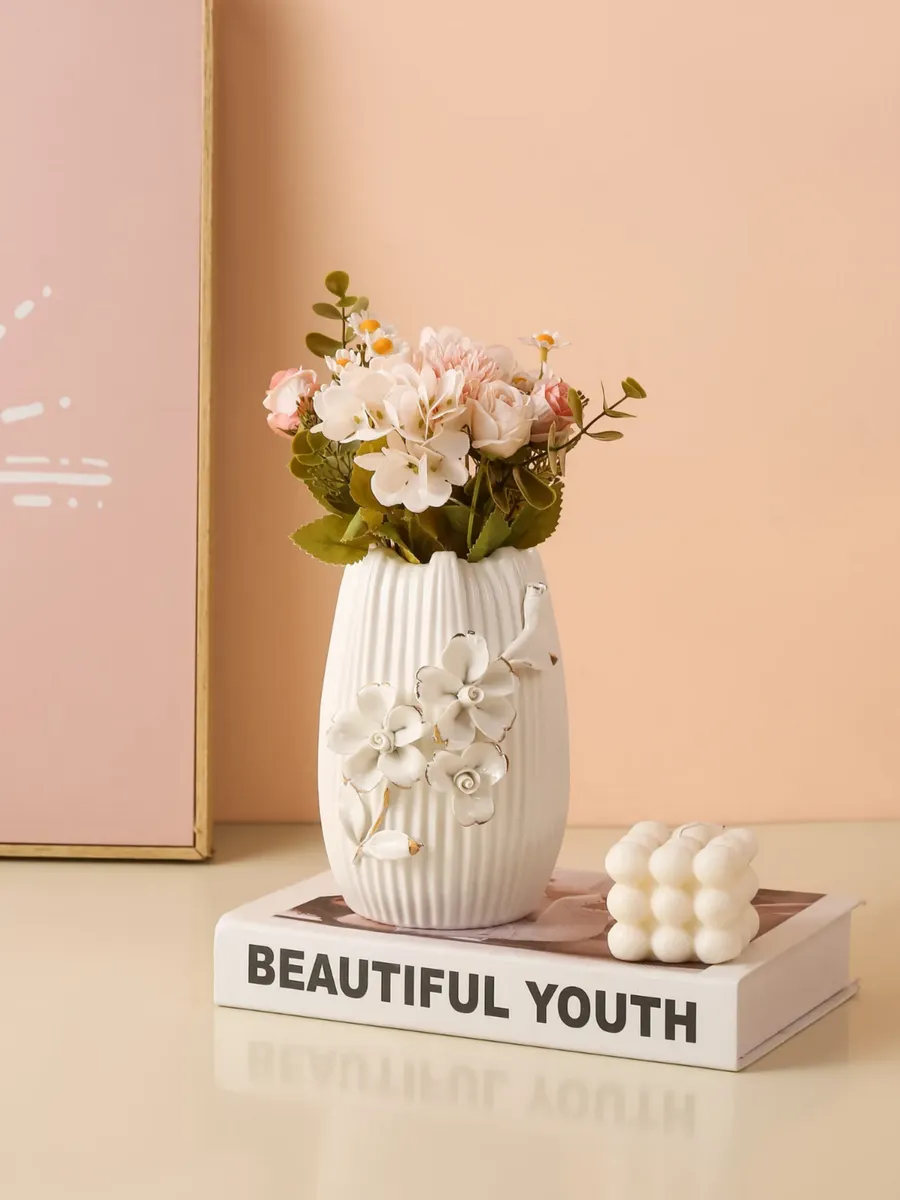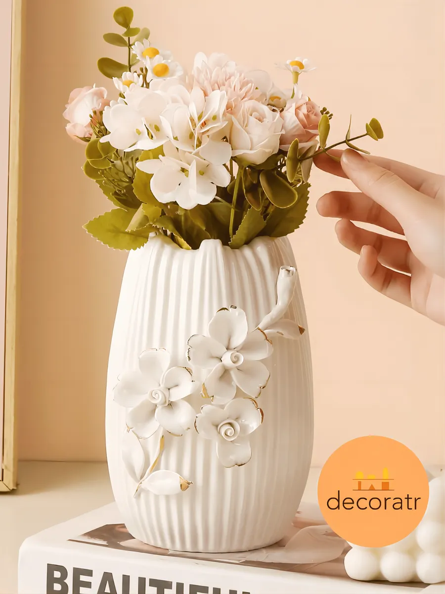 Вот это да! Рельефные цветочные композиции словно растут прямо из керамики, создавая объёмный декор, который хочется трогать снова и снова. Вертикальные рифлёные линии добавляют элегантности, а молочно-белый оттенок с лёгким кремовым подтоном делает вазу универсальной для любого интерьера.