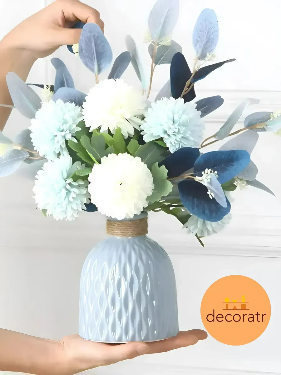 Ваза керамическая светло-голубая, не высокая и маленькая, высота 15 см, настольная, глянцевая и непрозрачная, с декором.