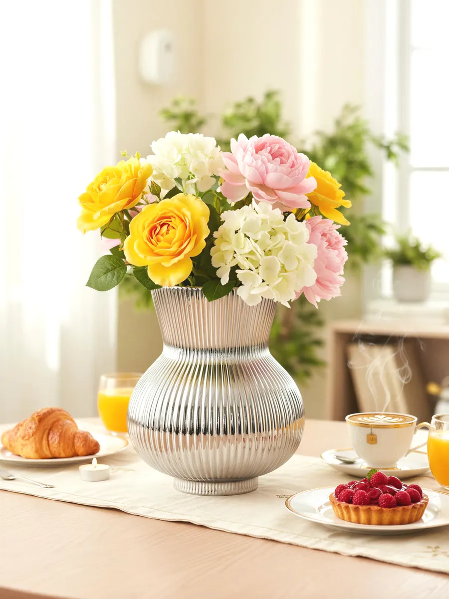 Представьте, как эта ваза для букетов преобразит ваш дом! Утренний свет, пробивающийся через окно, заставит её поверхность мерцать, как драгоценный металл. Вечером при тёплом освещении она создаст атмосферу уюта и роскоши.