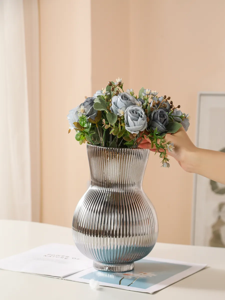 Эта керамическая ваза для цветов поражает своей изысканной рифленой поверхностью, которая играет бликами света, создавая завораживающие переливы. Каждая вертикальная линия — это штрих мастера, превращающий обычную керамику в произведение искусства! Серебристый металлик с нежными голубоватыми переливами напоминает морскую раковину, отполированную волнами до совершенства.
