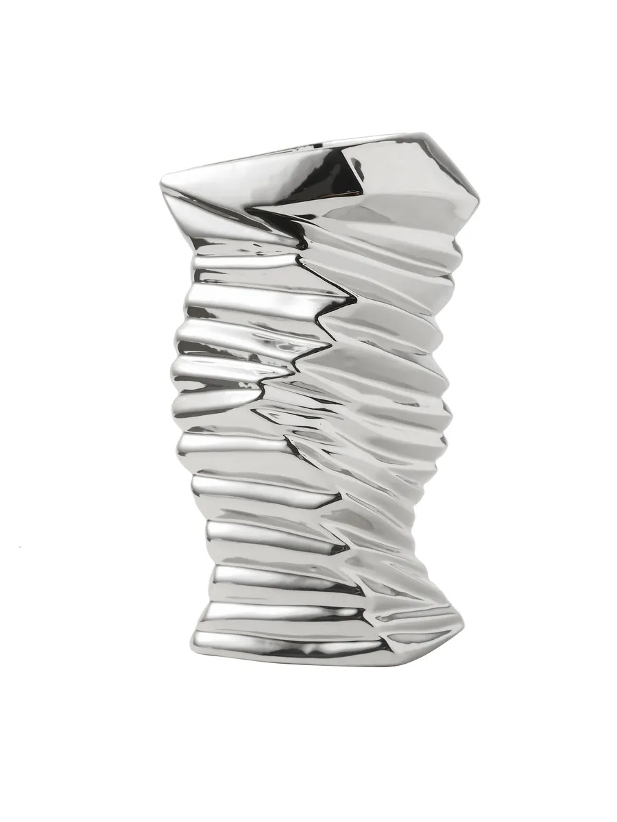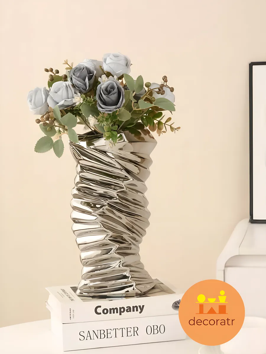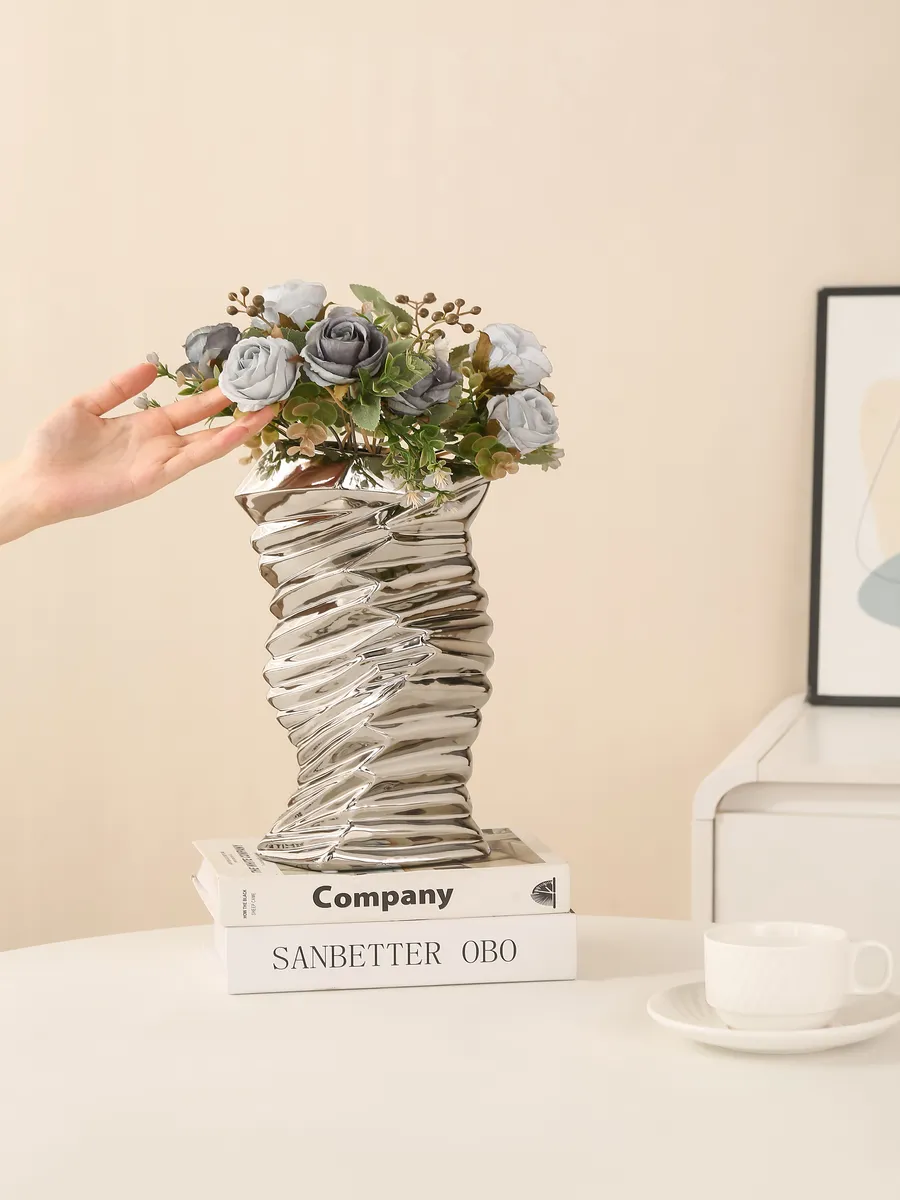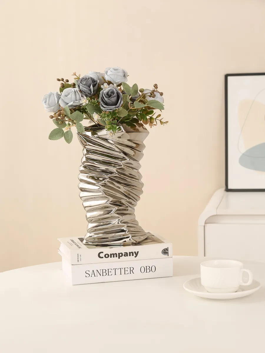 Керамическая ваза для цветов с уникальной спиральной фактурой словно закручивается в танце, создавая объёмный рельеф, который так приятно ощущать под пальцами. Серебристое покрытие переливается множеством оттенков — от тёплого шампанского до холодного платинового блеска, делая каждый угол обзора особенным.