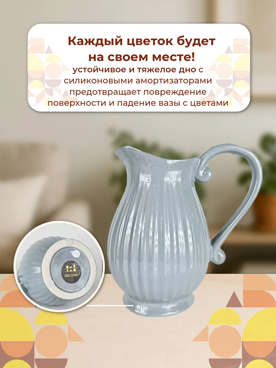 Представьте, как мягкий утренний свет играет на рельефной поверхности этой изящной вазы-кувшина высотой 20 см! Ваза «Морской бриз» — керамическая интерьерная ваза для цветов в нежном серо-голубом оттенке станет настоящей жемчужиной вашего дома.