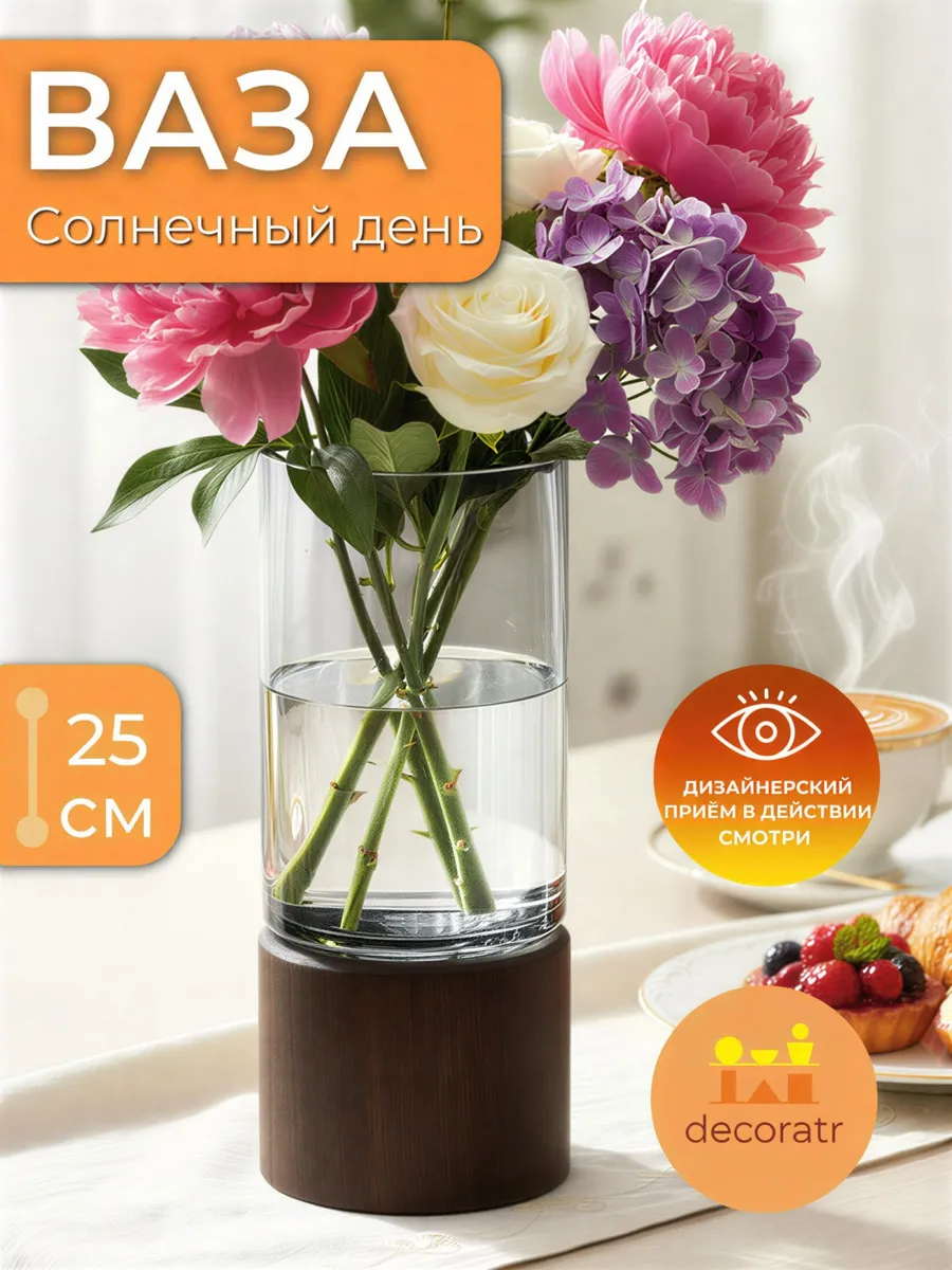Ваза стеклянная напольная отлично подходит для букетов роз, тюльпанов, пионов и даже сухоцветов. Высота 25 см позволяет создавать как компактные композиции для журнального столика, так и эффектные букеты для комода или подоконника. Холодная гладь стекла в руках и тёплая фактура дерева создают удивительное тактильное наслаждение!