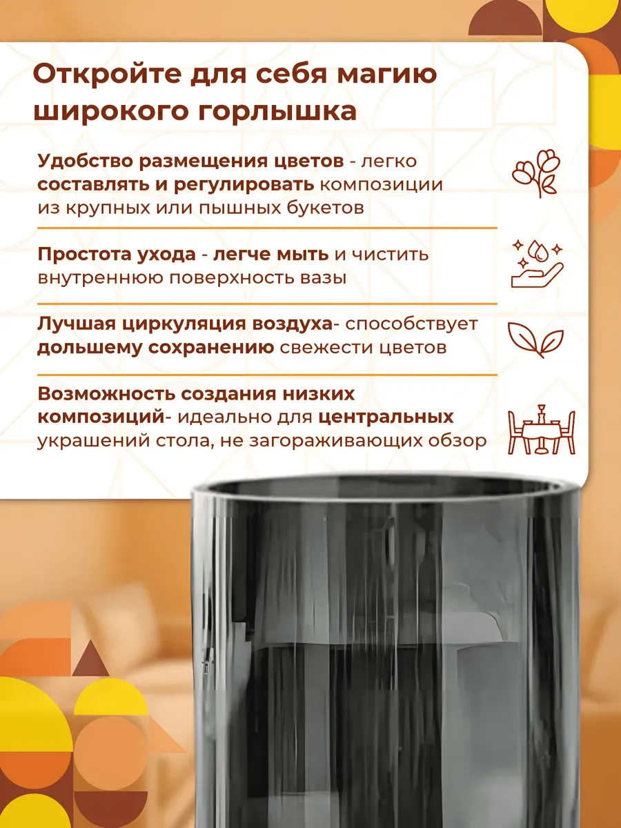 Представьте, как эта ваза интерьерная стеклянная преобразит ваш дом! Она станет центром внимания на любой полке, создавая ощущение дорогого дизайнерского интерьера. Гости непременно будут восхищаться вашим безупречным вкусом.