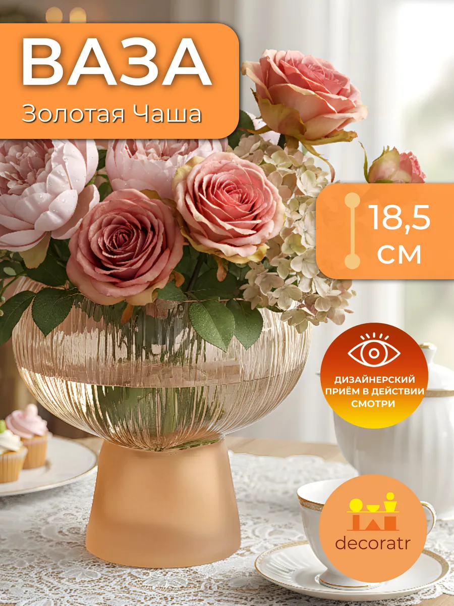 Представьте себе: солнечные лучи мягко проходят сквозь рифленое стекло, создавая на столе игру света и тени. Ваза «Золотая Чаша» высотой 18,5 см — это не просто декоративная ваза для дома, а настоящий арт-объект, который мгновенно преображает любое пространство!