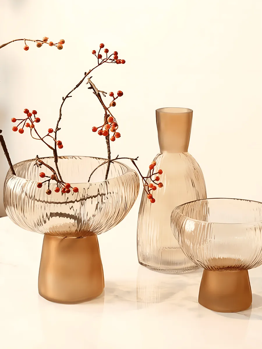 Эта интерьерная ваза из стекла завораживает своей необычной формой: широкая рифленая чаша словно парит на элегантной матовой подставке янтарного оттенка. Когда вы держите её в руках, чувствуете приятную прохладу гладкого стекла и удивительную устойчивость конструкции.