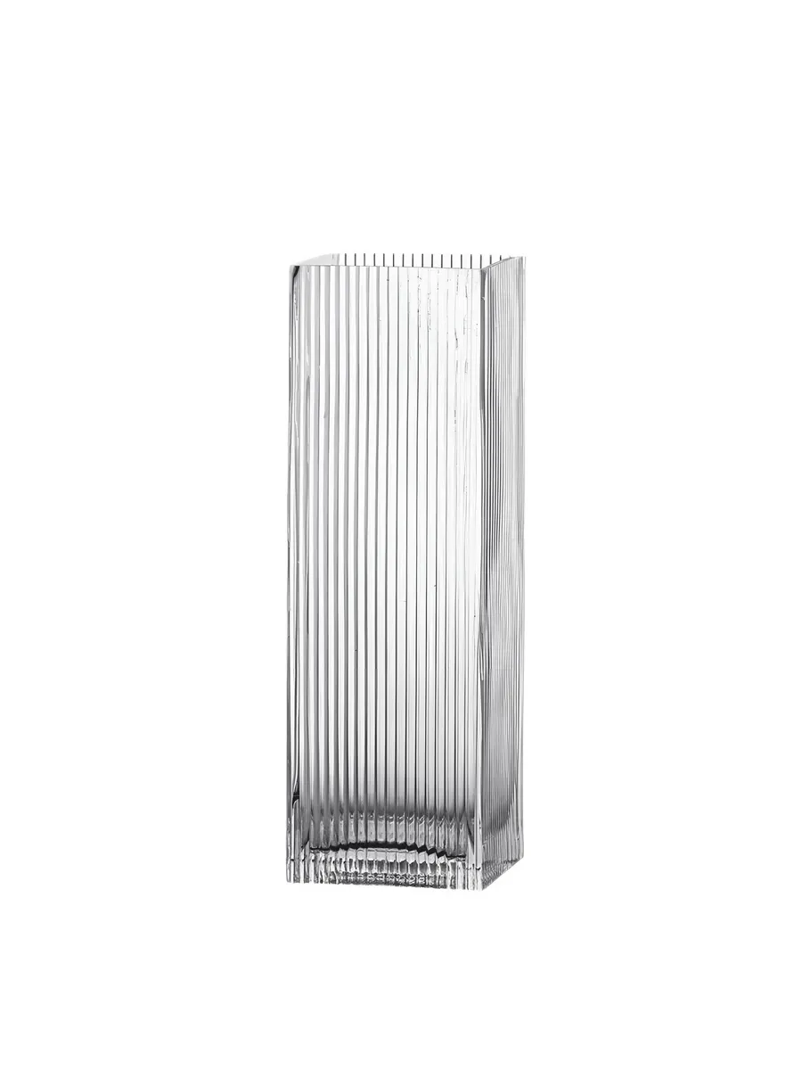 Ваза стеклянная прямоугольная, высокая и средняя, высота 30 см, настольная, глянцевая и прозрачная, без декора.