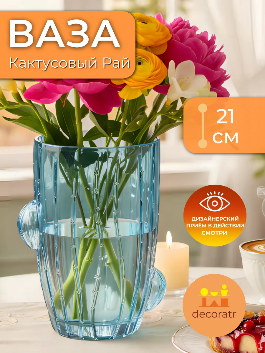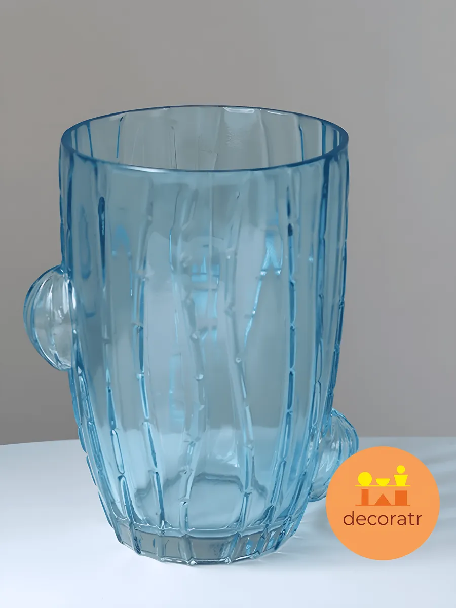 Представьте, как нежный голубой оттенок этой изящной вазы высотой 21 см наполняет ваш дом морской свежестью и безмятежностью! Ваза «Кактусовый Рай» — это не просто стеклянная ваза для цветов, это настоящий арт-объект, который мгновенно преображает любое пространство.