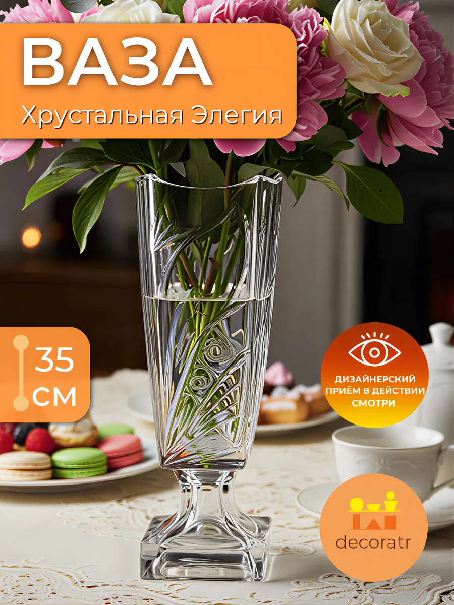 Представьте себе утро, когда солнечные лучи проходят сквозь прозрачное стекло, создавая волшебную игру света в вашей гостиной! Ваза «Хрустальная Элегия» высотой 35 см — это не просто стеклянная ваза для цветов, это настоящее произведение искусства, которое мгновенно преображает любое пространство.