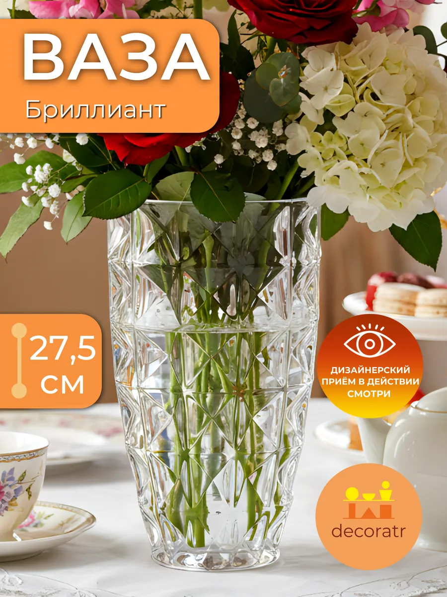 Представьте, как солнечные лучи танцуют на гранях этой изумительной вазы высотой 27,5 см, создавая в вашем доме настоящую симфонию света и блеска! Ваза «Бриллиант» — это не просто интерьерная ваза для цветов, это произведение искусства, которое превращает обычный букет в роскошную композицию.