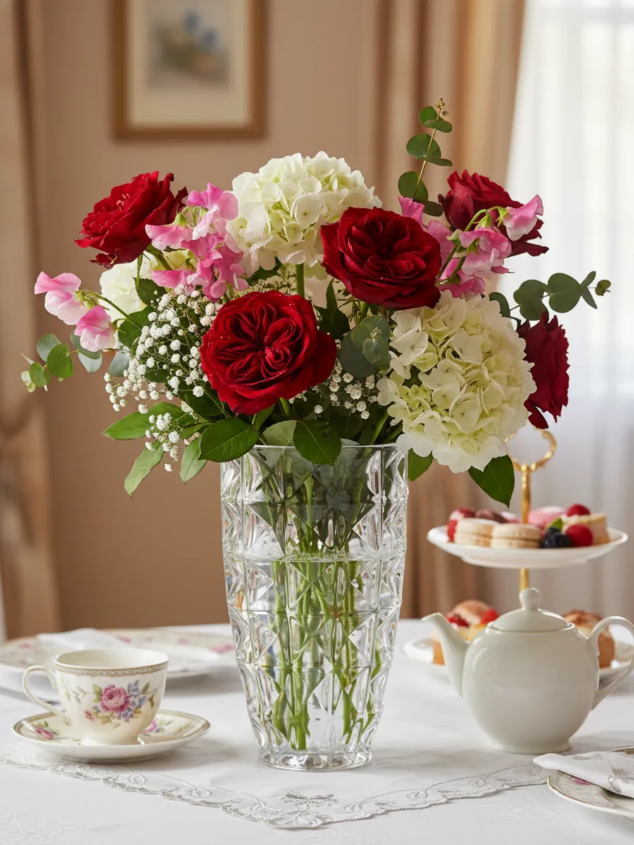 Наш главный декоратор, Анна Велесова, советует: «Разместите вазу напротив окна или рядом с источником света — эффект будет потрясающим! Даже без цветов она создаёт атмосферу праздника. А для особого случая добавьте LED-подсветку снизу — получите настоящую световую скульптуру».