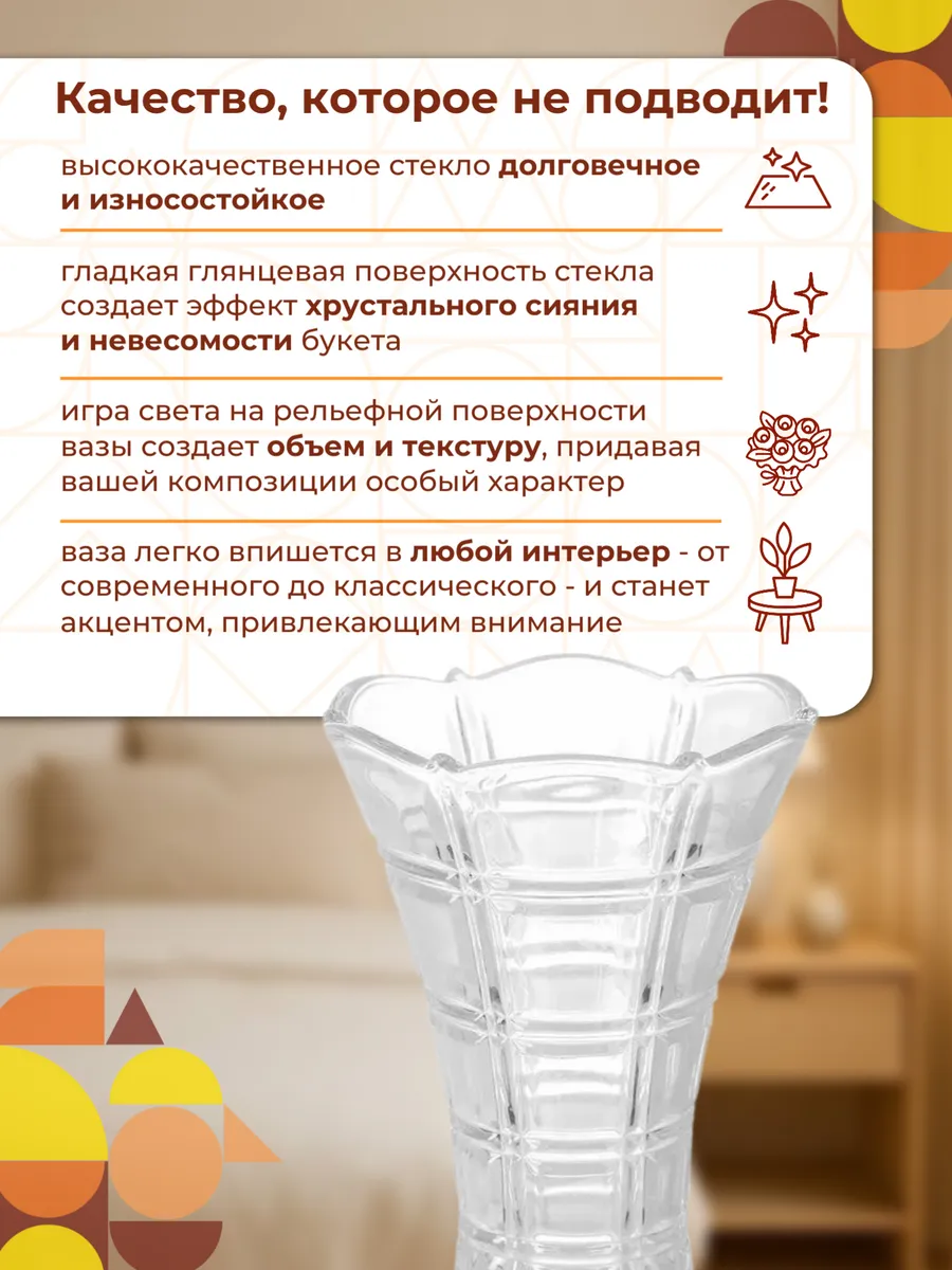 Ваза для цветов стеклянная — это не просто предмет декора, это инвестиция в красоту вашего дома! Устойчивое основание гарантирует безопасность даже при случайном касании, а качественное стекло легко моется и не теряет блеск годами.