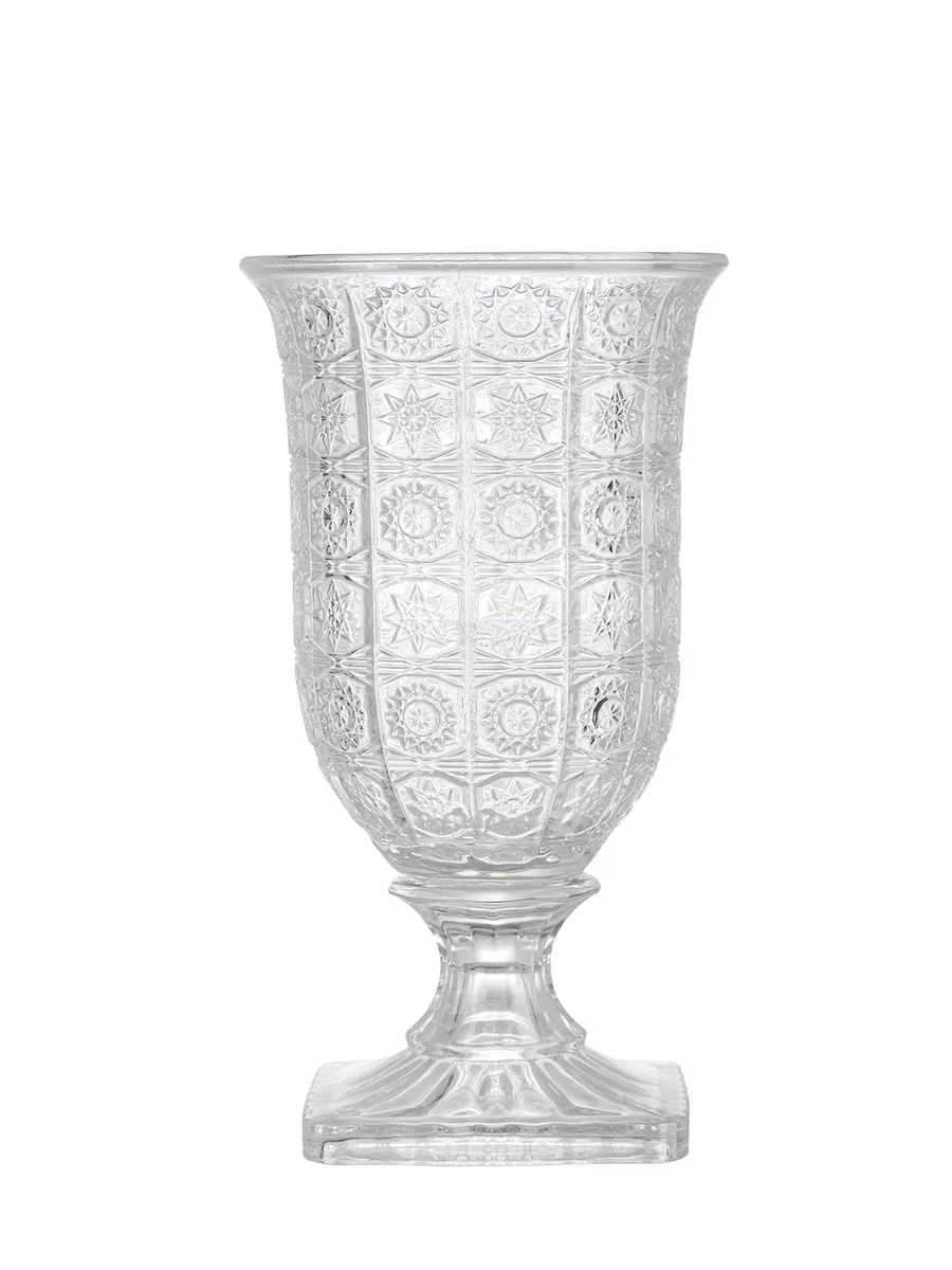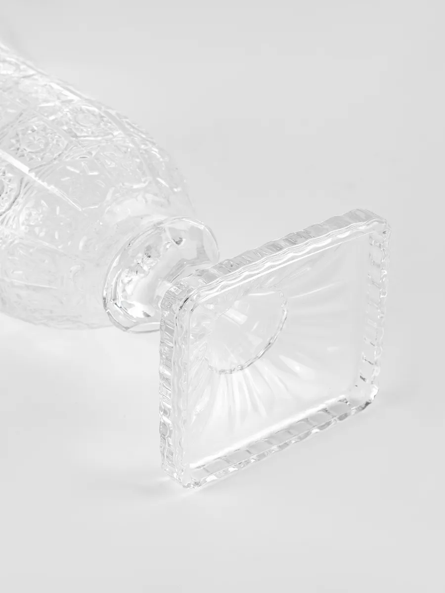 Декоративные элементы: Гранёная фактура в виде квадратных сегментов; рельефные геометрические узоры внутри каждого квадрата; классическая ножка с фасетками