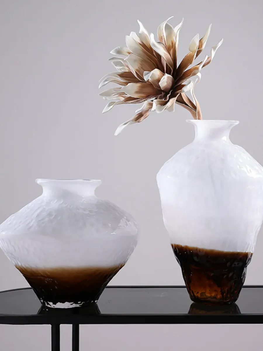 Какая магия скрывается в этом стеклянном чуде? Верхняя часть вазы выполнена из прозрачного стекла с изящной рельефной поверхностью, которая создает удивительную игру света и тени. А нижняя часть словно окутана теплым янтарно-коричневым градиентом, который плавно переходит в глубокий темно-коричневый оттенок у основания.