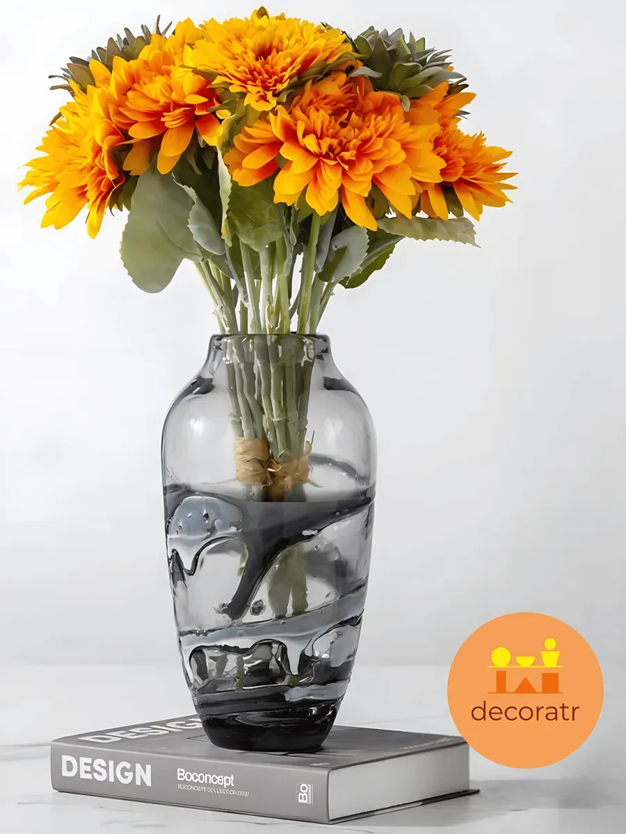 Представьте только: ваза высотой 25 см, словно созданная самой природой из прозрачного стекла с завораживающими дымчатыми потоками! Ваза «Дымка Элегантности» — стеклянная интерьерная ваза для цветов — это настоящее произведение искусства, которое преобразит любое пространство одним своим присутствием.