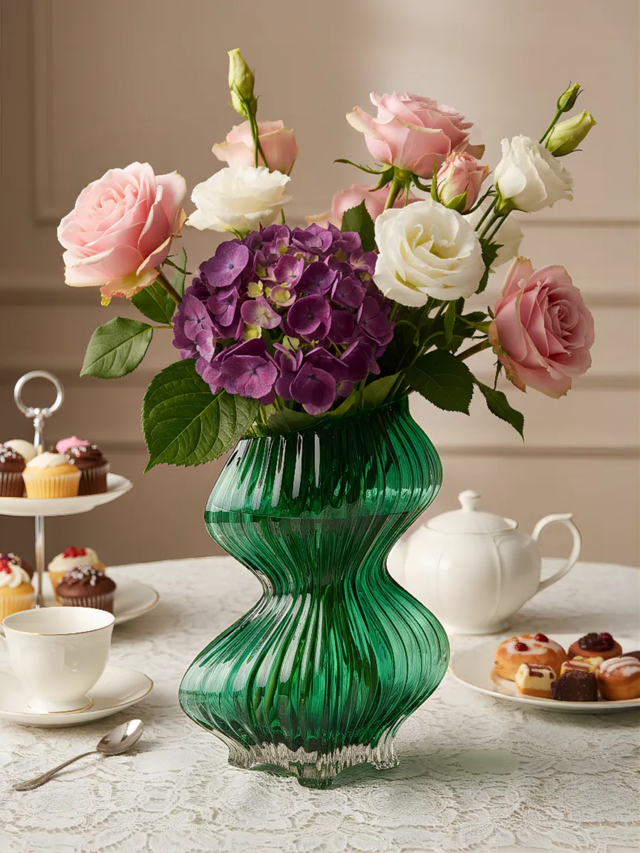 Каждая грань этой рифленой красавицы играет светом, создавая завораживающие блики на стенах. Волнообразная форма напоминает морские течения, застывшие в изумрудном стекле. Когда солнечные лучи проходят сквозь её стенки, комната наполняется мягким зеленоватым сиянием — настоящая магия цвета!