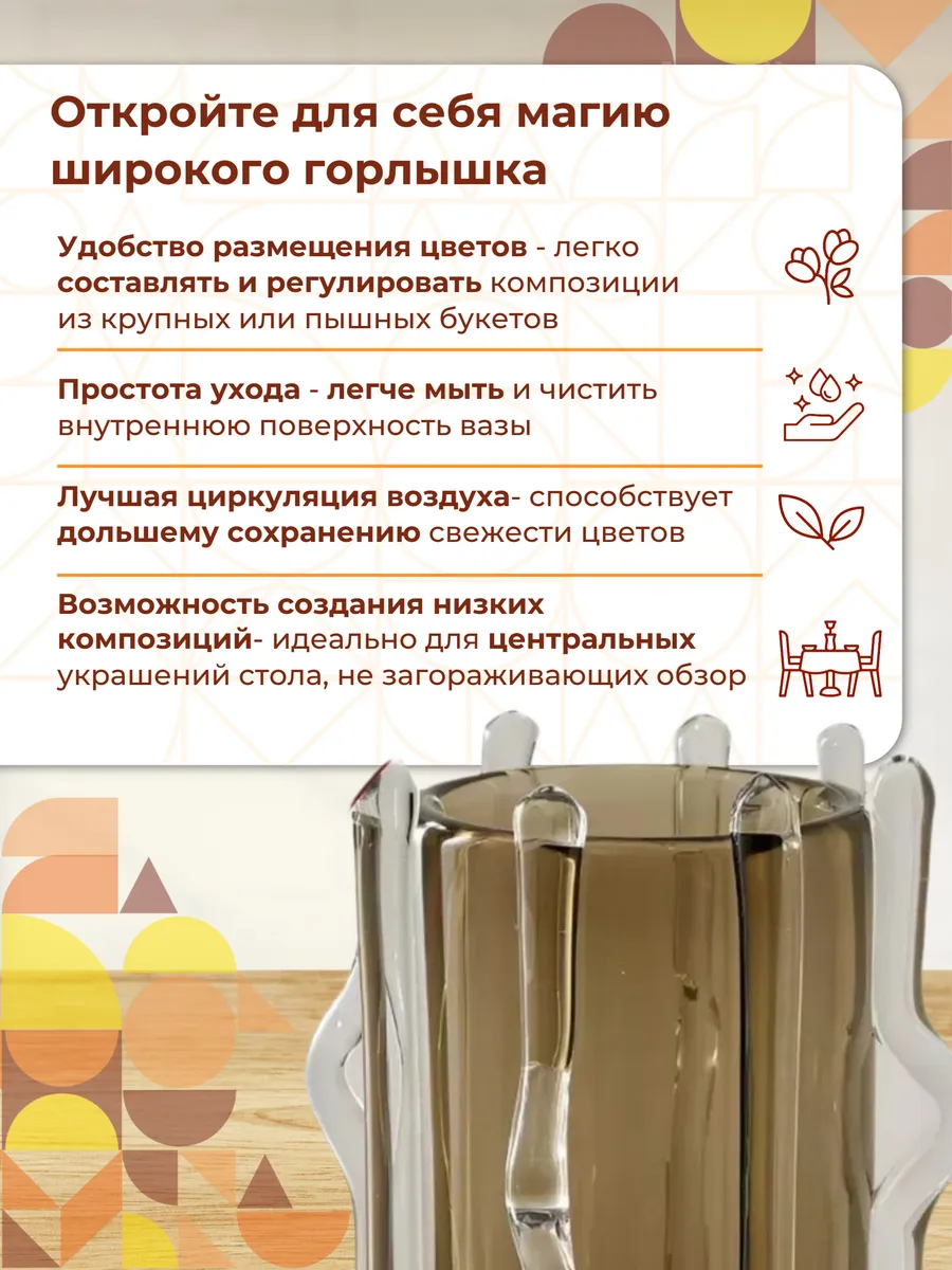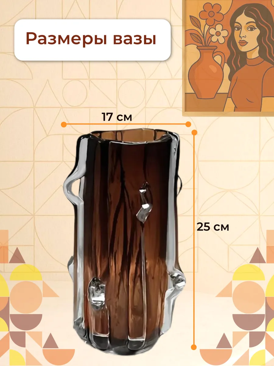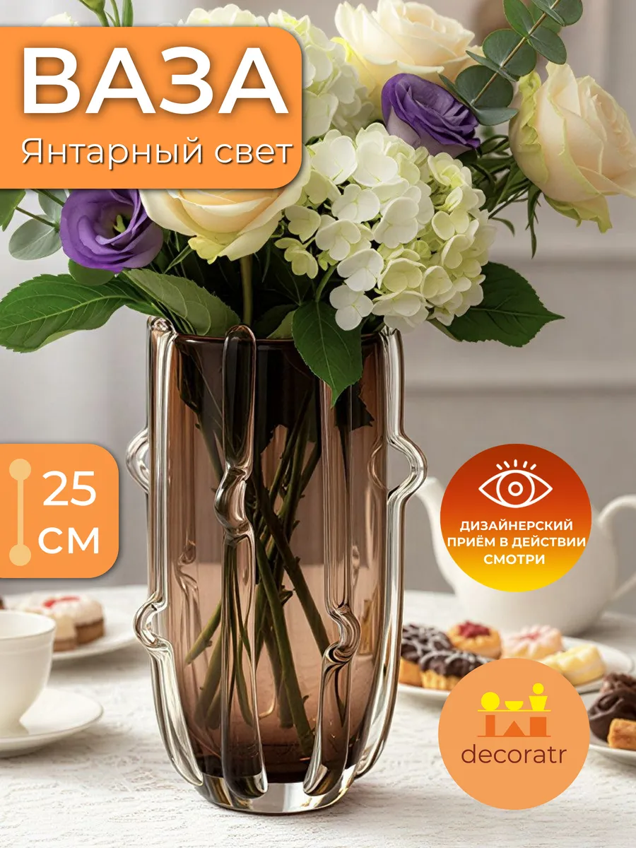 Эта стеклянная ваза для цветов с первого взгляда покоряет своей изысканной формой и благородным коричневым оттенком. Представьте, как солнечные лучи проникают сквозь её прозрачные стенки, окрашивая пространство в тёплые янтарные тона! Высота 25 см делает её идеальной для букетов из роз, пионов, хризантем или элегантных веток сухоцветов.