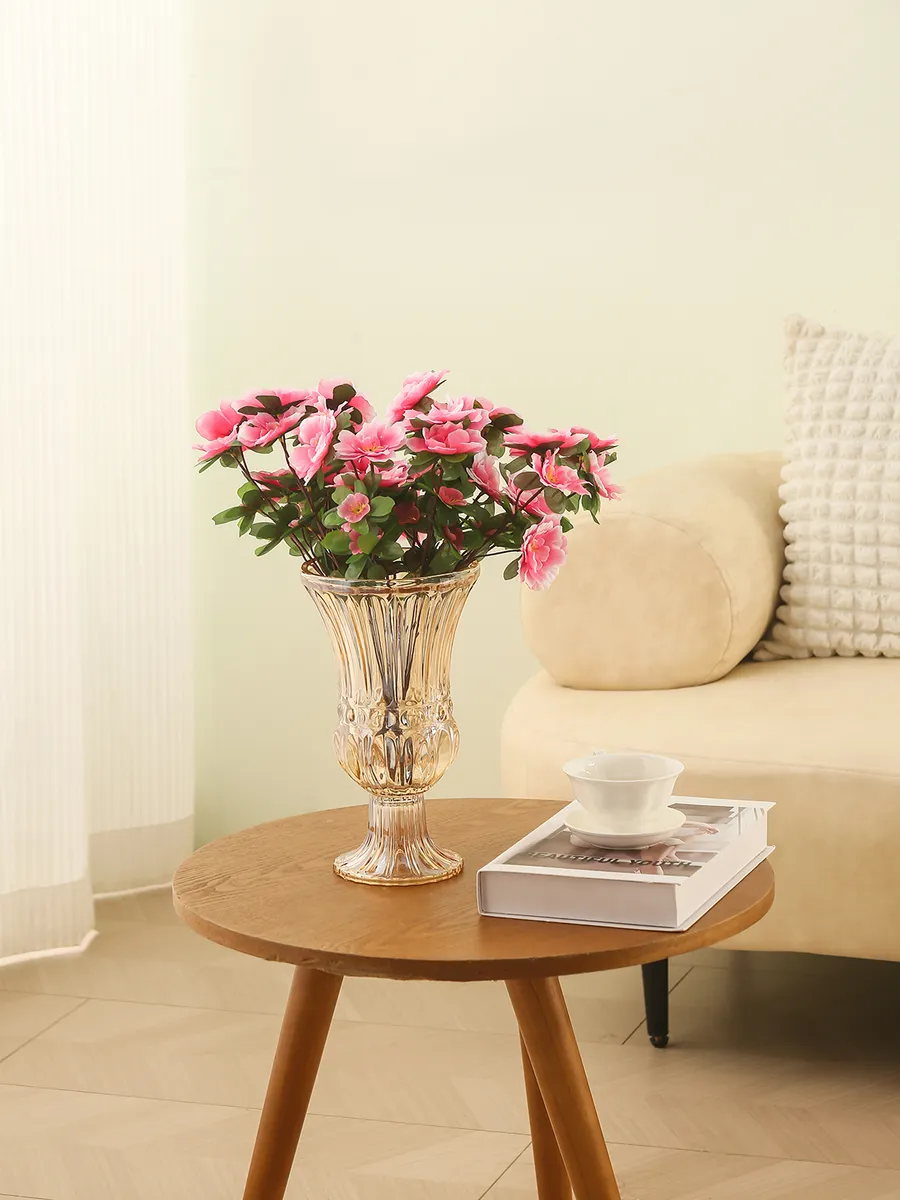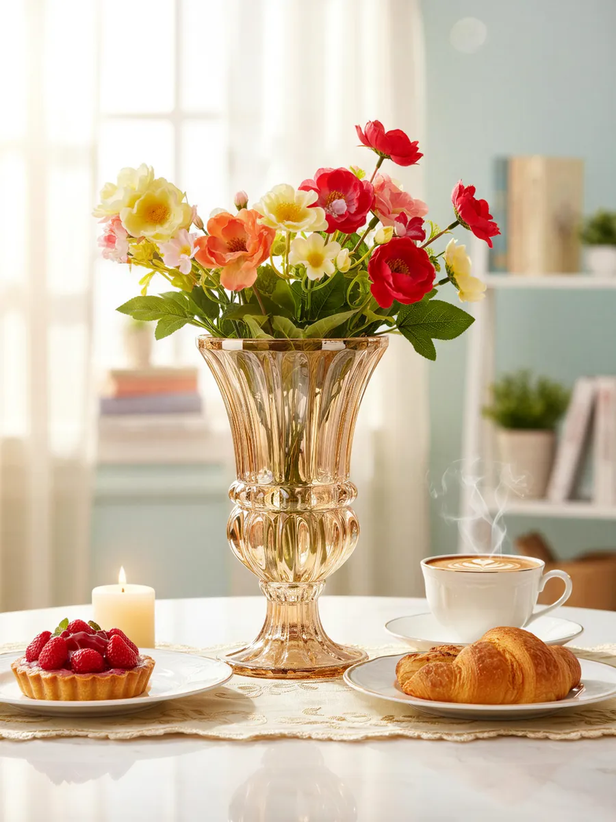 Эта великолепная стеклянная ваза на ножке словно создана для особенных моментов. Её изысканная форма с рельефными гранями напоминает античную чашу, а золотистый оттенок стекла добавляет тёплое сияние любому пространству. Каждая линия продумана до мелочей — от элегантного расширения кверху до устойчивой ножки, которая гарантирует надёжность даже самых пышных букетов роз или пионов.