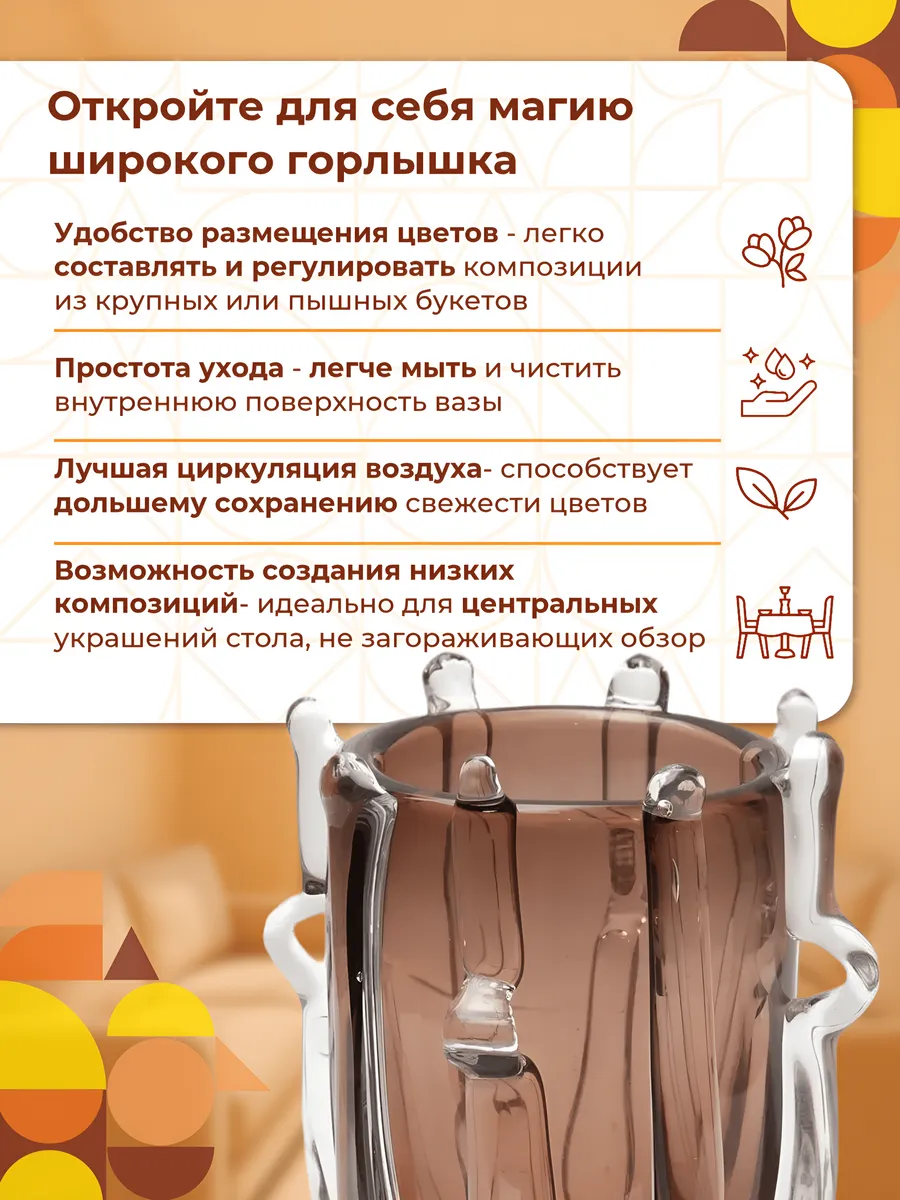 Стеклянная ваза для дома — это не просто предмет декора, это способ выразить свой безупречный вкус! Устойчивая конструкция гарантирует, что даже высокие букеты будут надёжно закреплены, а уход за изделием максимально прост — достаточно тёплой воды и мягкой губки.