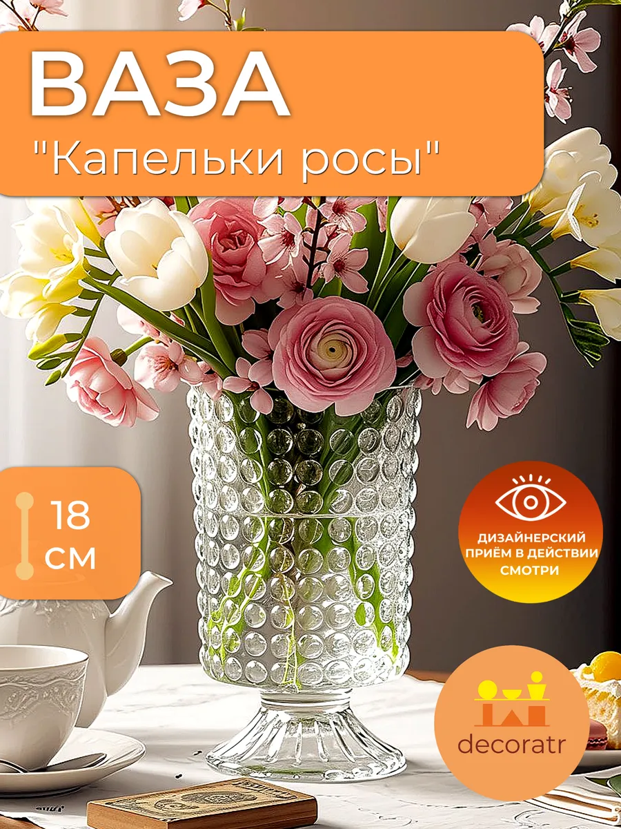 Представьте утро, когда солнечные лучи играют в каплях росы на лепестках… Именно такое волшебство создаёт эта изысканная стеклянная ваза высотой 18 см! Ваза «Капельки росы» — это не просто интерьерная ваза для цветов, а настоящий шедевр, который превращает обычный букет в произведение искусства.