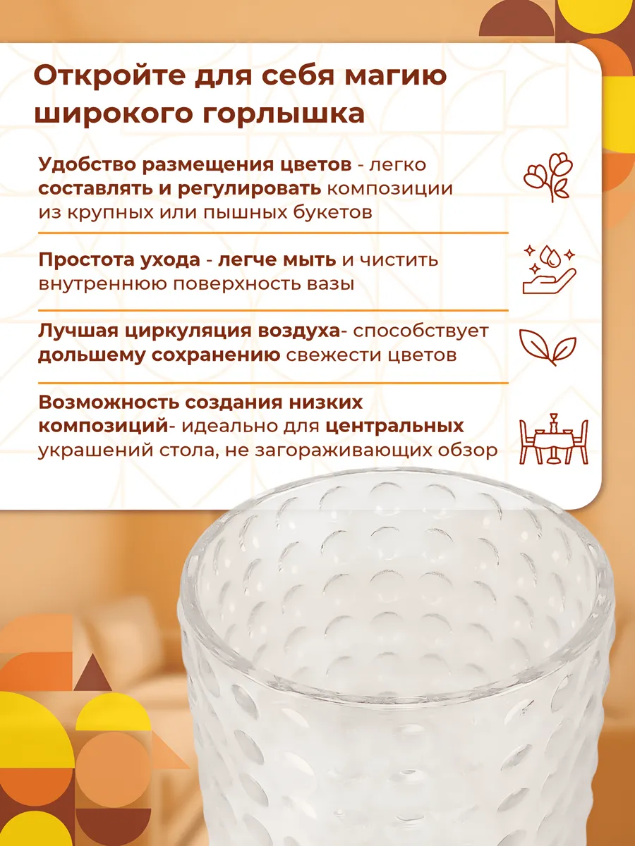 Ваза интерьерная стеклянная — это не просто покупка, это инвестиция в красоту вашего дома! Представьте, как гости будут восхищаться этой изысканной деталью. Ваза для букета станет изюминкой любого праздничного стола, а в обычные дни будет радовать глаз даже без цветов.