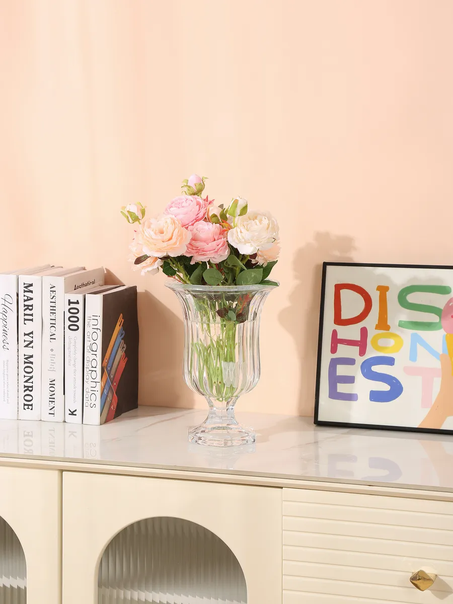 Изысканная форма в виде классического кубка на устойчивой ножке словно создана для торжественных моментов. Вертикальные рифлёные грани играют со светом, создавая удивительные блики и отражения, которые наполняют пространство магическим сиянием. Прозрачное стекло позволяет любоваться не только букетом, но и самими стеблями — настоящий театр красоты прямо у вас дома!
