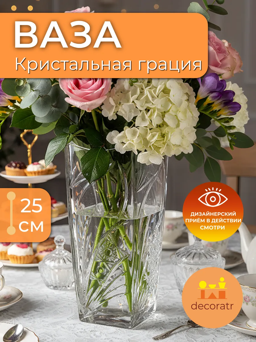 Представьте себе утро, когда солнечные лучи играют в гранях прозрачного стекла, а ваши любимые цветы словно парят в воздухе! Ваза «Кристальная Грация» высотой 25 см — это именно то волшебство, которое превратит обычный букет в произведение искусства.