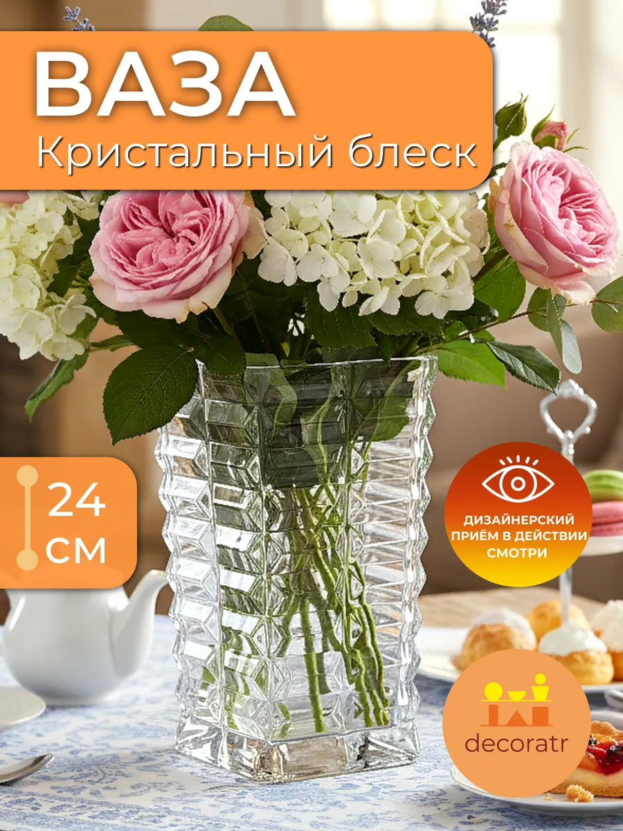 Представьте, как солнечные лучи играют в гранях этого стеклянного чуда! Ваза «Кристальный блеск» высотой 24 см — это настоящее произведение искусства, которое превратит любой букет в роскошную композицию. Каждая грань этой интерьерной вазы для цветов ловит и преломляет свет, создавая невероятные блики по всей комнате!