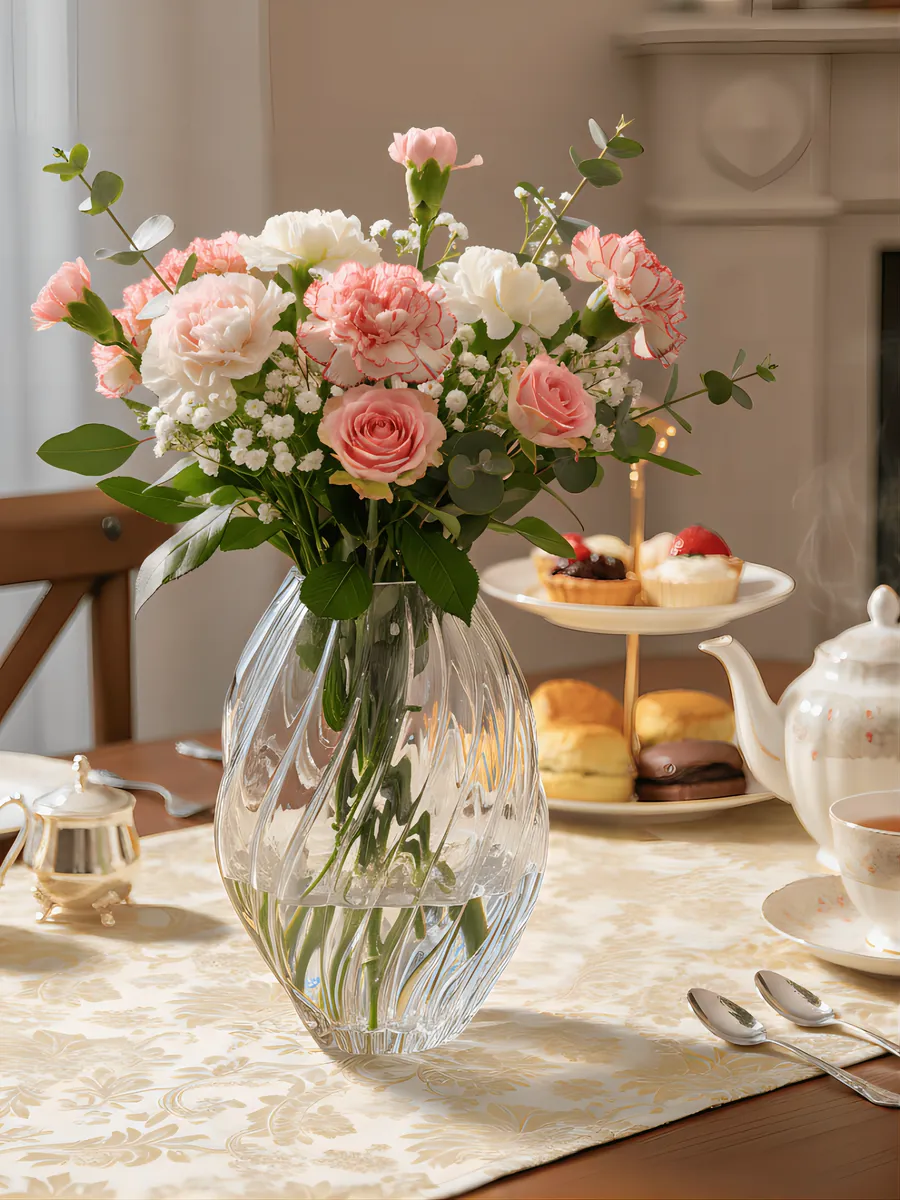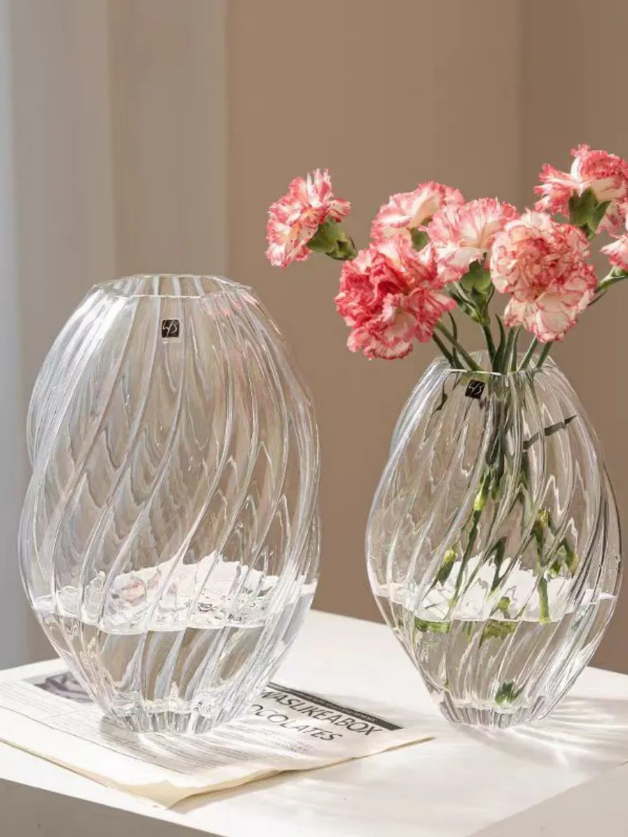 Эта стеклянная ваза для цветов словно создана самой природой — её рельефная поверхность напоминает морские волны, застывшие в прозрачном хрустале. Каждая грань отражает свет под уникальным углом, создавая потрясающую игру теней и бликов, которая завораживает с первого взгляда!