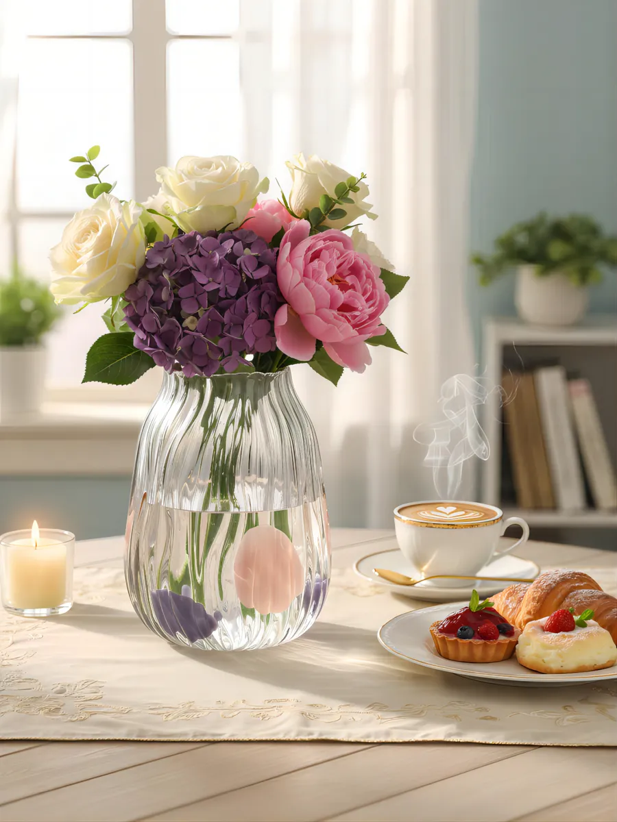 Интерьерная ваза прекрасно впишется в стиль минимализм или скандинавский интерьер, где ценится чистота линий и игра света. Рифленая поверхность создает объемную текстуру, которая меняется в зависимости от освещения — утром она кажется нежно-розоватой, а вечером приобретает теплый золотистый оттенок.