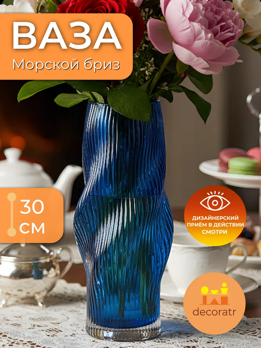 Ваза для цветов стеклянная прекрасно впишется в интерьер гостиной, спальни или кабинета. Она станет центральным акцентом в стиле минимализм или сканди, добавив нотку морской свежести и современной элегантности. Рифленая текстура и градиентная окраска делают эту вазу универсальным элементом декора для любого пространства.