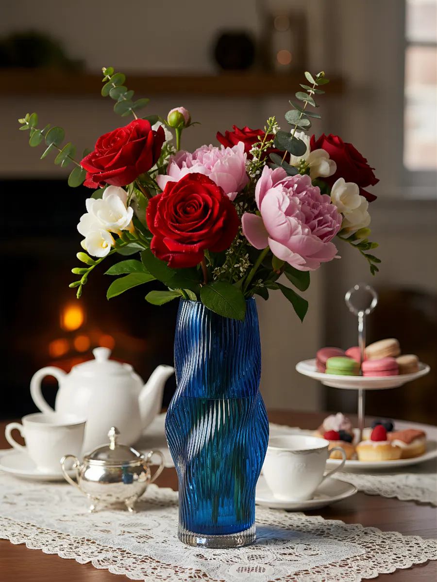 Наш главный декоратор, Мария Северская, советует: «Размещайте такую вазу на светлых поверхностях — мраморе, светлом дереве. Рифленая текстура создает дополнительную глубину, а синий цвет успокаивает и гармонизирует пространство. Попробуйте поставить рядом свечи — эффект будет потрясающим!»