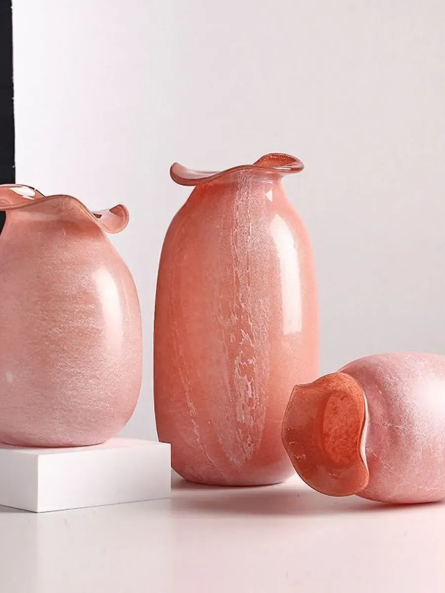 Изящная овальная форма с волнообразным горлышком напоминает морскую раковину, бережно хранящую жемчужину. Нежный розово-коралловый оттенок с лёгким перламутровым блеском создаёт ощущение, словно ваза выточена из драгоценного камня. Когда вы берёте её в руки, чувствуете приятную прохладу гладкого стекла и его идеальную тяжесть — признак качественного материала.