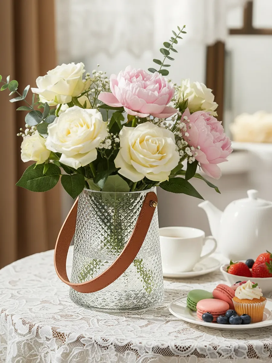Стиль этой вазы — современная классика с нотками скандинавского минимализма. Прозрачное стекло с алмазной огранкой напоминает о традициях богемского хрусталя, а кожаная ручка добавляет современный акцент. Именно такие детали выбирают дизайнеры интерьеров для создания стильных композиций!