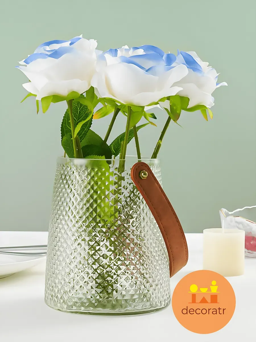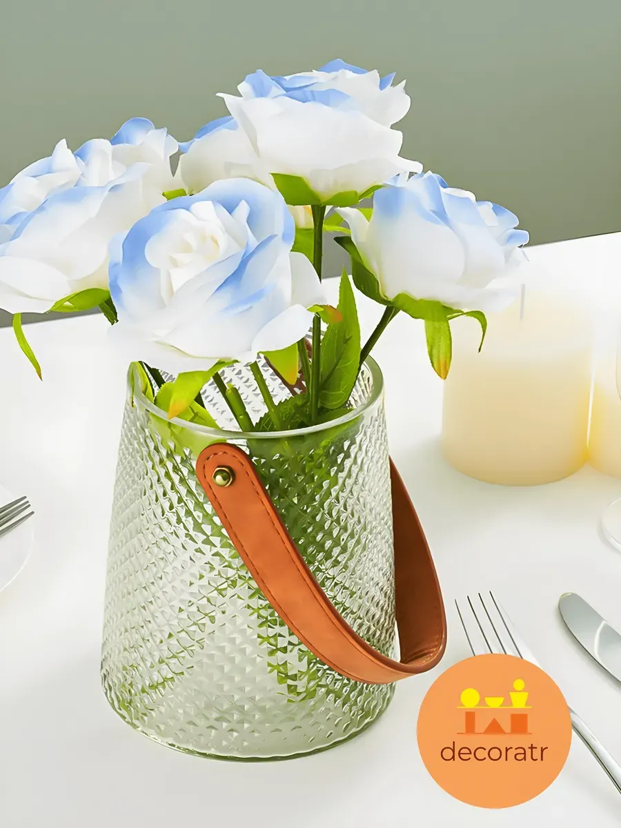 Представьте, как эта удивительная ваза высотой 15 см преображает ваш интерьер одним своим присутствием! Ваза «Кристальный Браслет» — стеклянная интерьерная ваза для цветов с кожаной ручкой создаёт неповторимую атмосферу элегантности и уюта.
