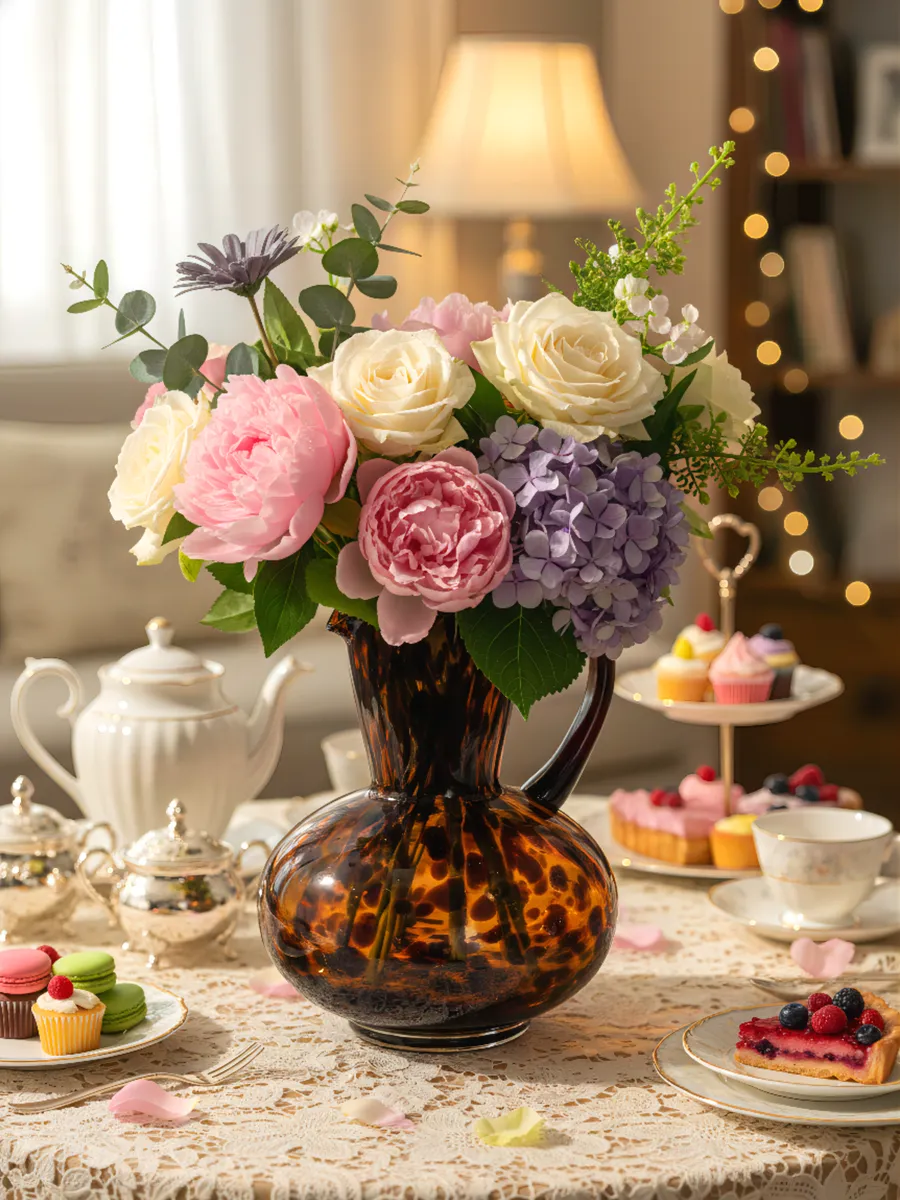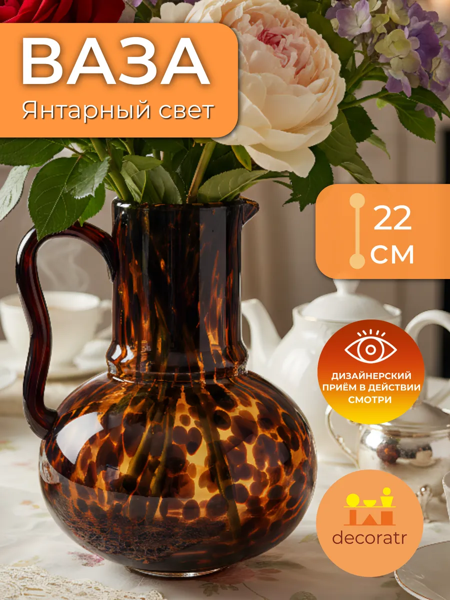 Эта изысканная ваза для цветов из стекла словно хранит в себе тепло осеннего солнца. Уникальная черепаховая расцветка с янтарными и коричневыми переливами создаёт завораживающий эффект — каждый угол обзора открывает новые грани красоты! Удобная изогнутая ручка не только добавляет элегантности, но и делает перестановку букета лёгкой и безопасной.