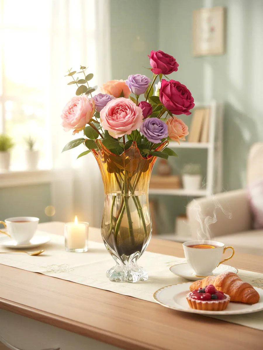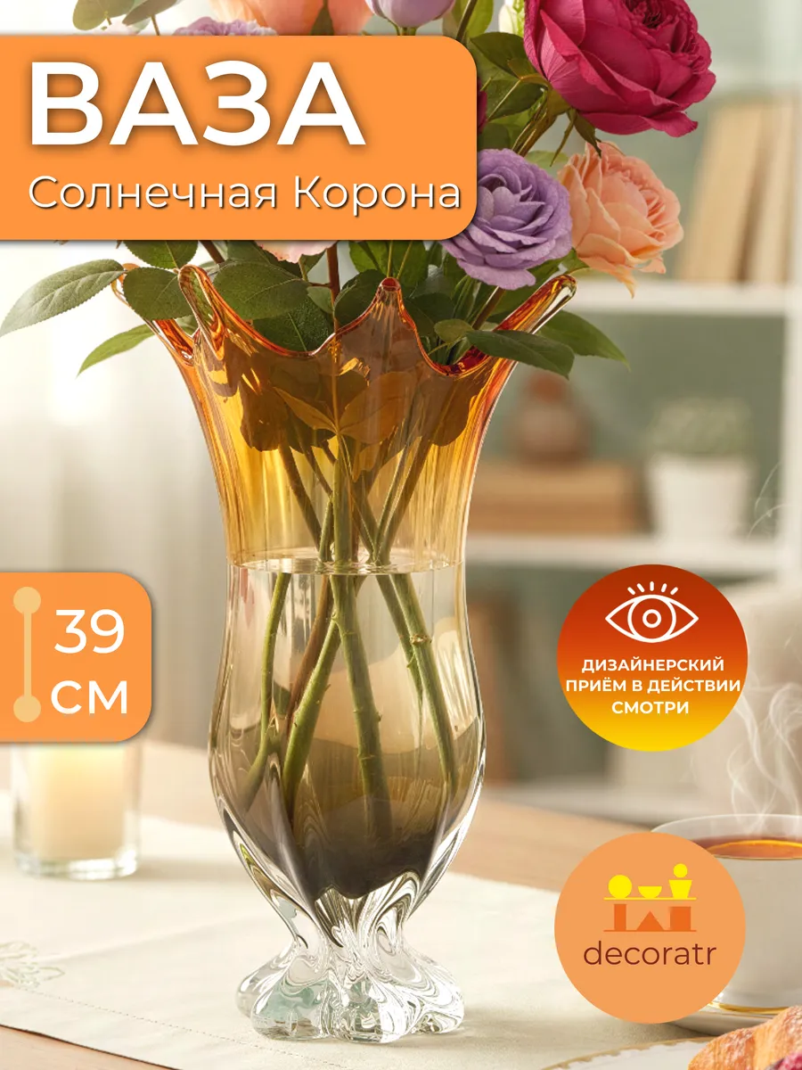 Интерьерные вазы такого уровня — выбор дизайнеров и ценителей прекрасного. Наш главный декоратор, Елена Морская, советует: «Янтарное стекло создаёт удивительную игру света. Поставьте вазу напротив окна — и комната наполнится золотистыми бликами. Попробуйте использовать её не только для цветов, но и как самостоятельный арт-объект!»