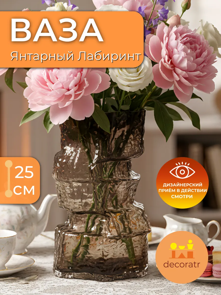 Представьте себе стеклянную вазу высотой 25 см, которая словно застывшая во времени скульптура из янтарного стекла! Ваза «Янтарный Лабиринт» — это не просто интерьерная ваза для цветов, а настоящий арт-объект, который мгновенно преображает любое пространство.
