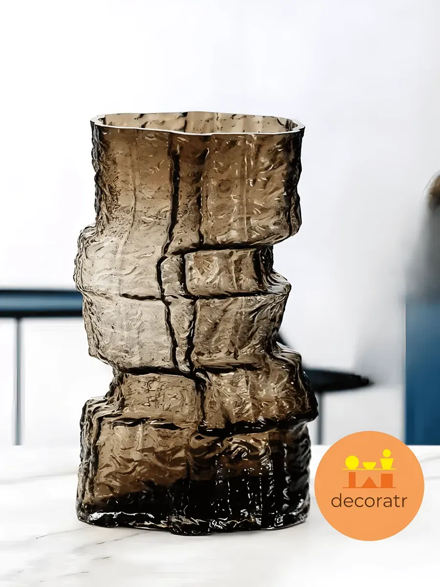 Каждый сегмент этой удивительной вазы из стекла создаёт игру света и тени, словно солнечные лучи преломляются сквозь кристаллы древней смолы. Фактурная поверхность с рельефными квадратами напоминает о современной архитектуре и одновременно отсылает к природным формам — будто кора дерева превратилась в драгоценный янтарь.