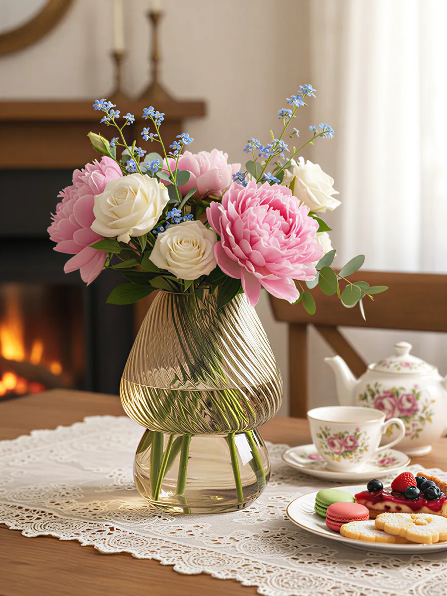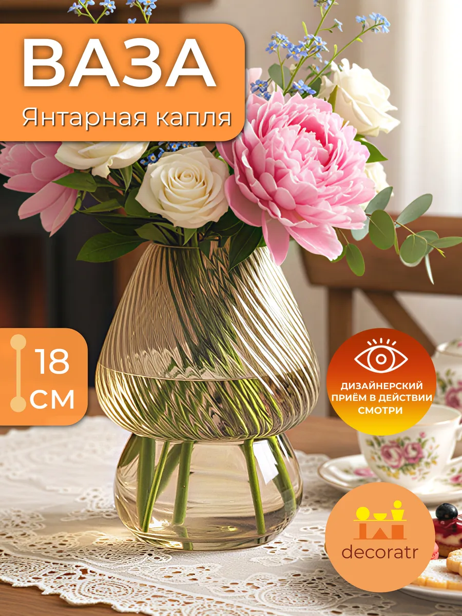 Ваза «Янтарная Капля» — это воплощение элегантности и утончённости! Её необычная двухуровневая форма с расширенной верхней частью и изящным прозрачным основанием делает её идеальной для букетов роз, тюльпанов, пионов или стильных композиций из сухоцветов. Рифлёная фактура верха создаёт потрясающие световые блики, превращая обычный букет в произведение искусства.