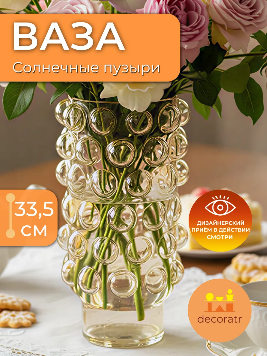 Представьте, как солнечные лучи играют в объёмных пузырьках этой удивительной стеклянной вазы высотой 33,5 см! Ваза «Солнечные Пузыри» — это не просто декоративная ваза для цветов, это настоящее произведение искусства, которое мгновенно преображает любое пространство.